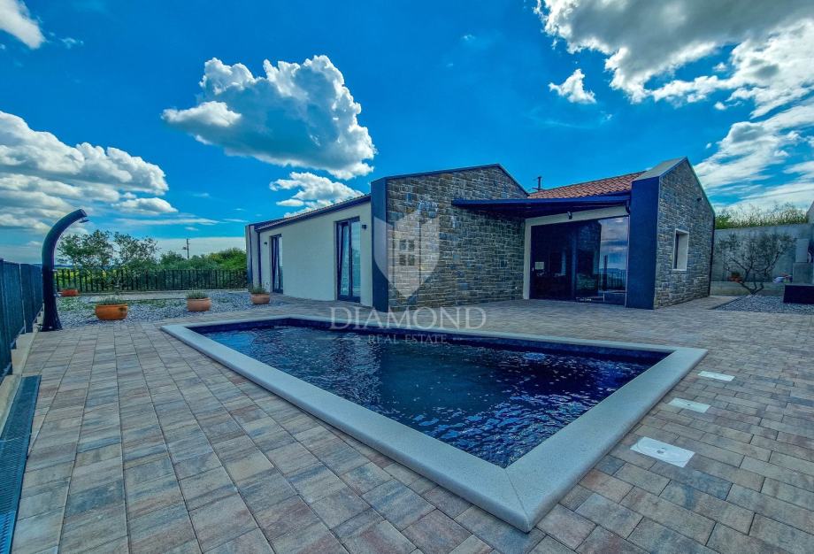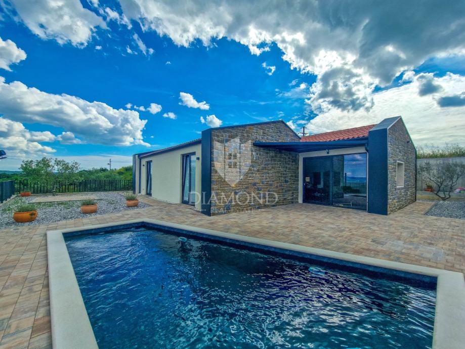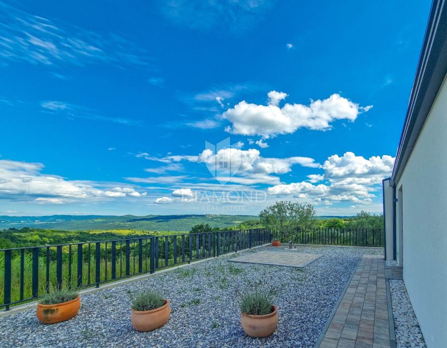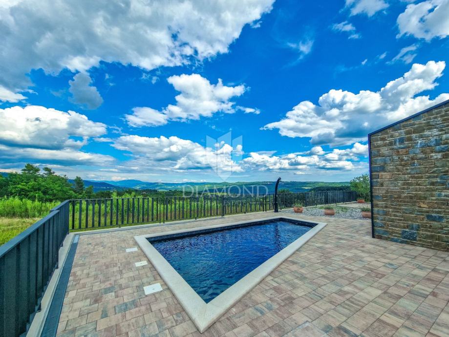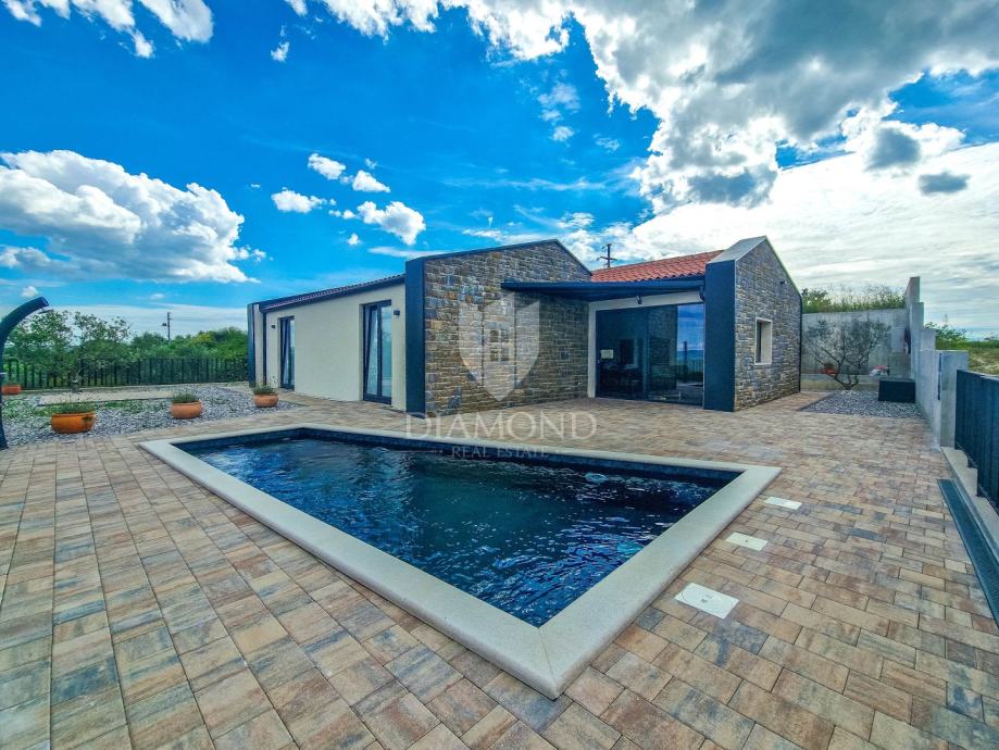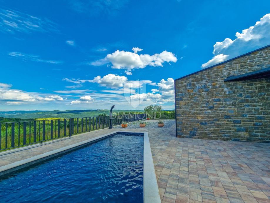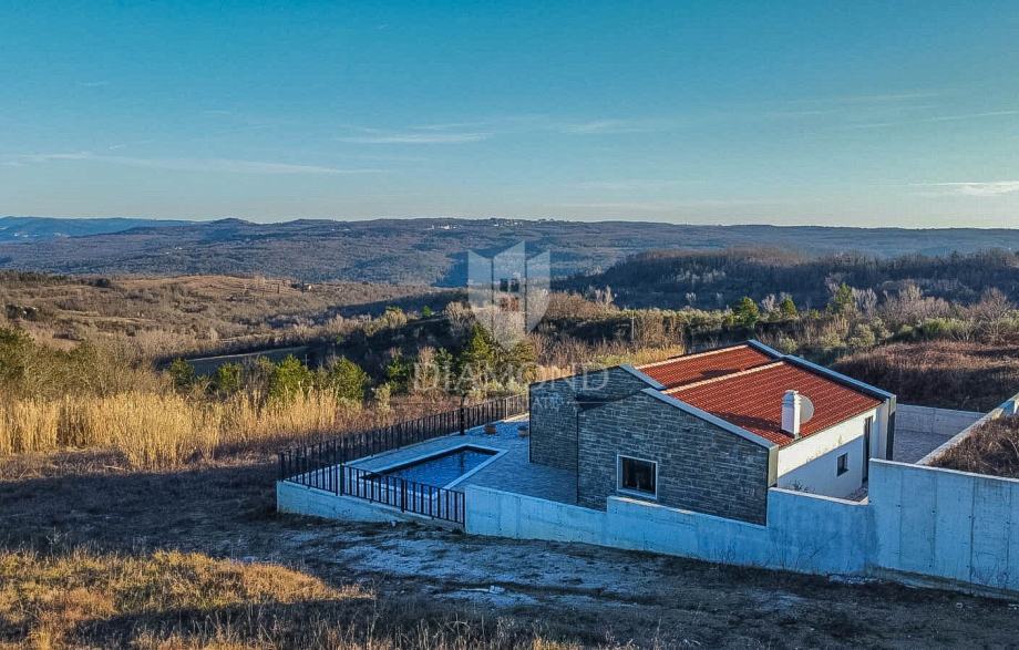 Kuća ukupne površine 145m2, s dvije spavaće, bazenom i neponovljivim pogledom na Motovun i dolinu rijeke Mirne. Ova lijepa prizemnica sastoji se od dnevnog boravka s kuhinjom i blagovaonicom, dvije spavaće sobe svaka sa svojim kupatilom te prostorijom za vešeraj s wc-om za goste. Iz dnevnog boravka se izlazi na otvorenu terasu s koje se pristupa na uređenu okućnicu na kojoj se nalazi bazen i sunčalište s prekrasnim otvorenim panoramskim pogledom na dolinu rijeke Mirne i na čarobni grad Motovun. Kuća je kvalitetne gradnje s podovima i stolarijom vrhunske kvalitete. Građena je u modernom stilu s dodacima Istarskog tamnog kamena iz unutrašnjosti Istre te visokim stropovima.