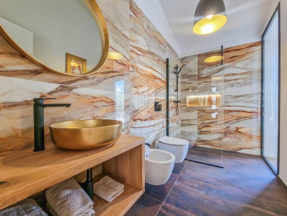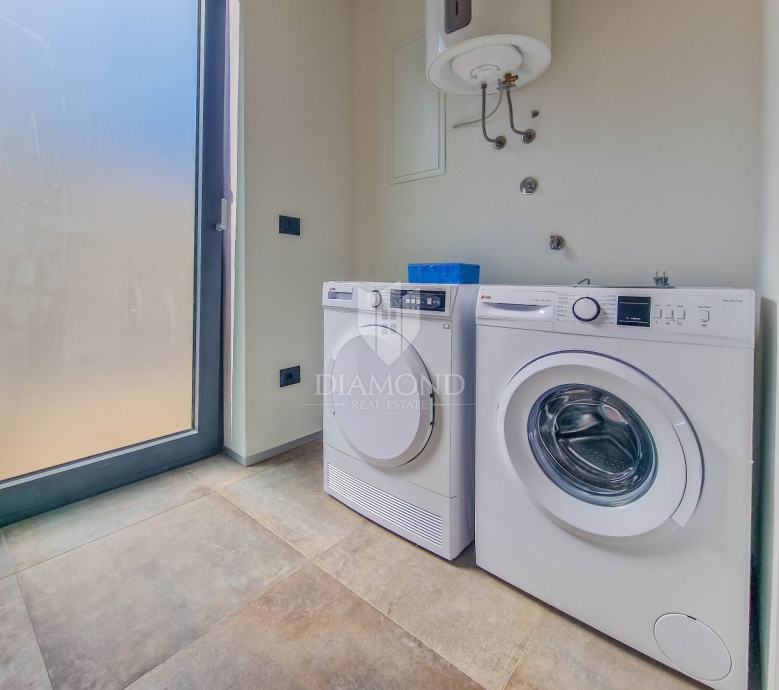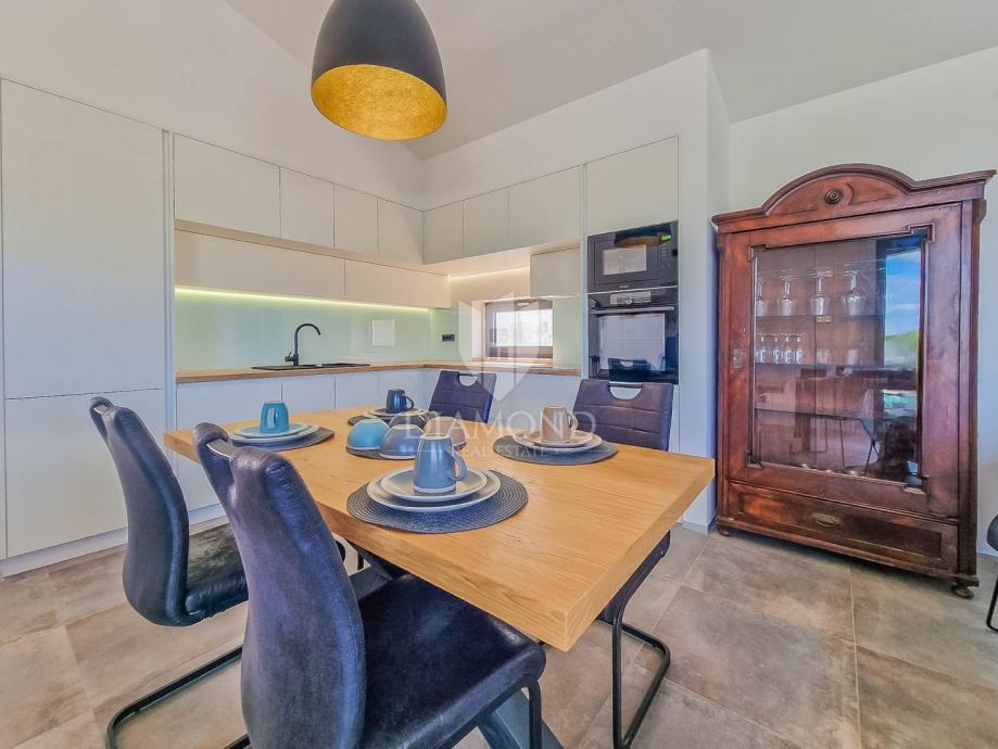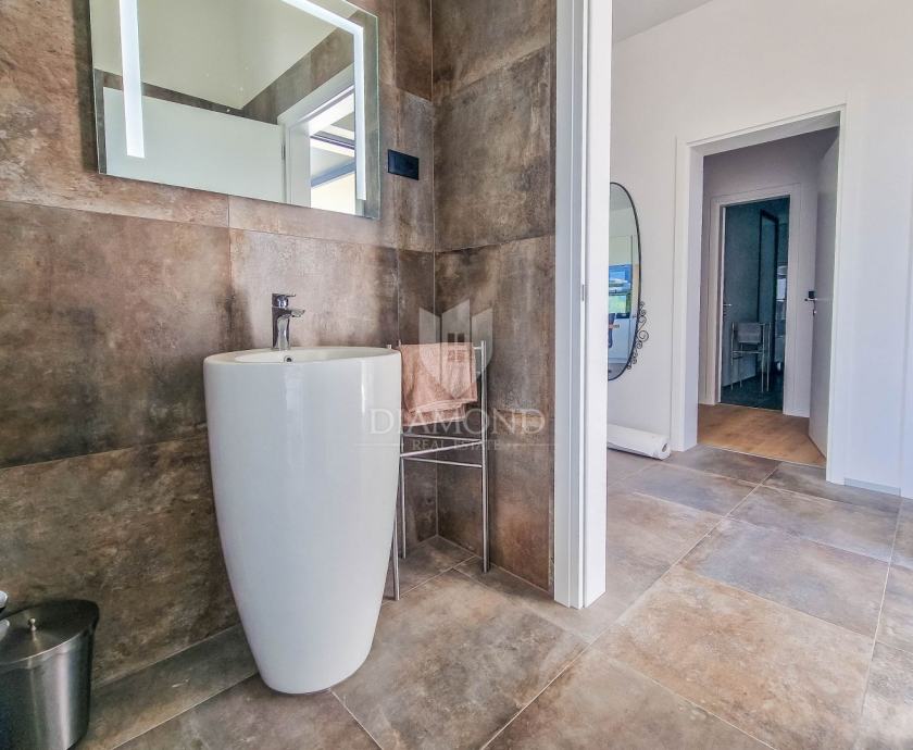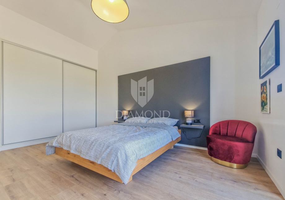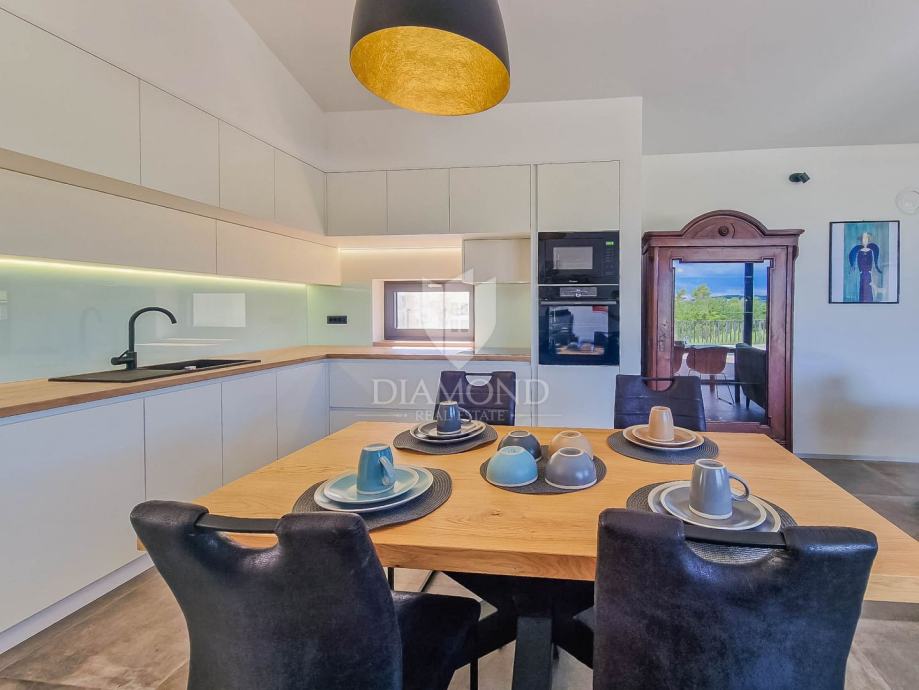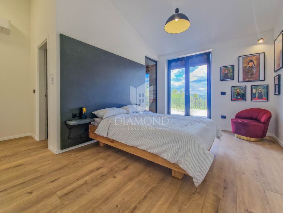 Kuća ukupne površine 145m2, s dvije spavaće, bazenom i neponovljivim pogledom na Motovun i dolinu rijeke Mirne. Ova lijepa prizemnica sastoji se od dnevnog boravka s kuhinjom i blagovaonicom, dvije spavaće sobe svaka sa svojim kupatilom te prostorijom za vešeraj s wc-om za goste. Iz dnevnog boravka se izlazi na otvorenu terasu s koje se pristupa na uređenu okućnicu na kojoj se nalazi bazen i sunčalište s prekrasnim otvorenim panoramskim pogledom na dolinu rijeke Mirne i na čarobni grad Motovun. Kuća je kvalitetne gradnje s podovima i stolarijom vrhunske kvalitete. Građena je u modernom stilu s dodacima Istarskog tamnog kamena iz unutrašnjosti Istre te visokim stropovima.