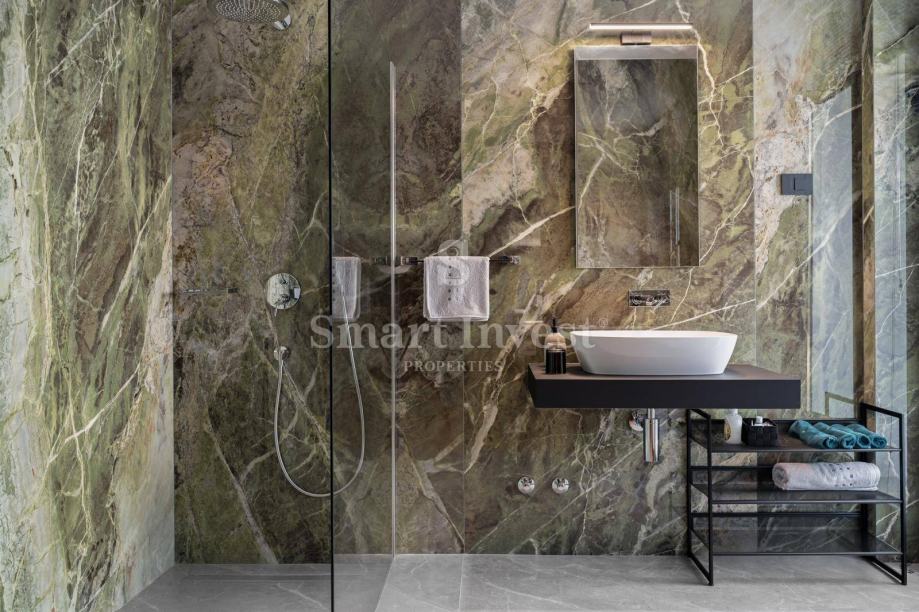 Kupaonice su opremljene luksuznim sanitarijama i modernim tuš kabinama, te su obložene dizajnerskim pločicama. Oprema je odabrana s ciljem udobnosti i dugovječnosti, uključujući visokokvalitetne armature i tuš sisteme. Vila je opremljena najkvalitetnijim materijalima i uređajima brandova Guzzini, Florim Bologna, Philipe Stark i Mitsubishi.