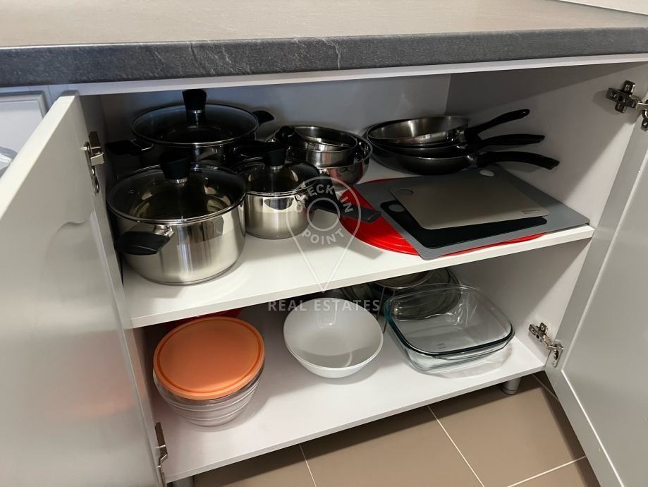 Stan je opremljen vrhunskim hrastovim parketom, drvenom stolarijom, klima uređajem, perilicom rublja, kompletno opremljenom kuhinjom (štednjak, pećnica, hladnjak, mikrovalna), protuprovalnim vratima.