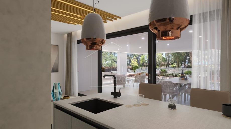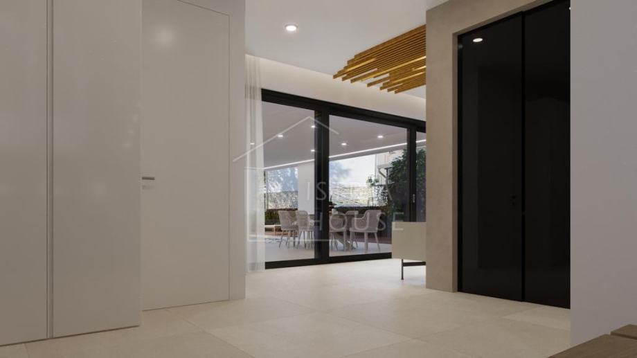 Prizemlje će se sastojati od garaže sa dva parkirna mjesta iz koje će se direktno ulaziti u kuću u prostor za druženje koje sačinjava kuhinja, veliki blagavaonski stol te ispred velika natkrivena terasa do koje je smješten bazen od 35.42 m2.