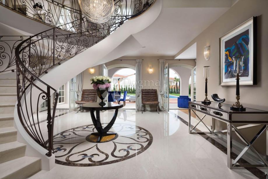 Otvoreni koncept dnevnog prostora prirodno se nastavlja na prostranu terasu s velikim grijanim bazenom površine 45 m², sunčalištem, lounge zonom, roštiljem i vanjskom blagovaonicom. Vila nudi prekrasan panoramski pogled te uređeni vrt s pažljivo biranom mediteranskom hortikulturom.