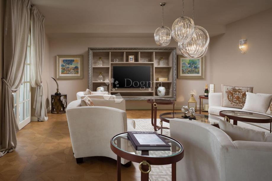 Prostran, izvanredan unutrašnji prostor ispunjen je prirodnim svjetlom zahvaljujući velikim panoramskim staklenim stijenama. Pažljivo biran namještaj u dnevnom boravku i otvoren pogled prema terasi stvaraju izniman osjećaj prostora i ugode. Moderna kuhinja je u potpunosti opremljena vrhunskim aparatima te dizajnirana za funkcionalnost i estetiku.