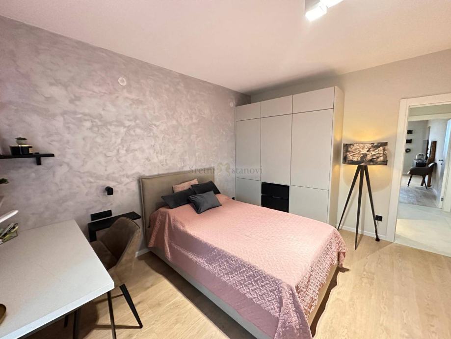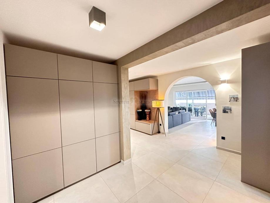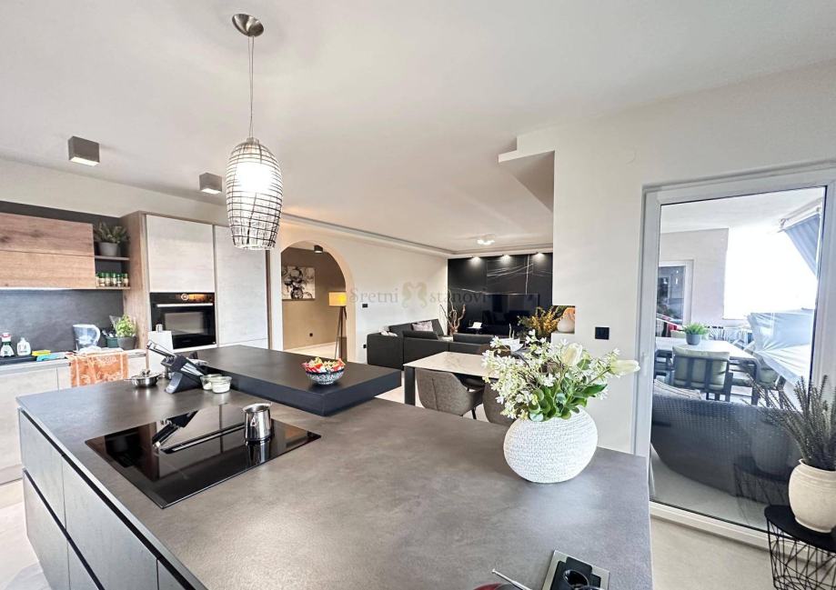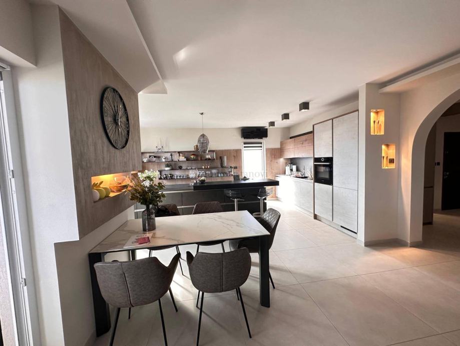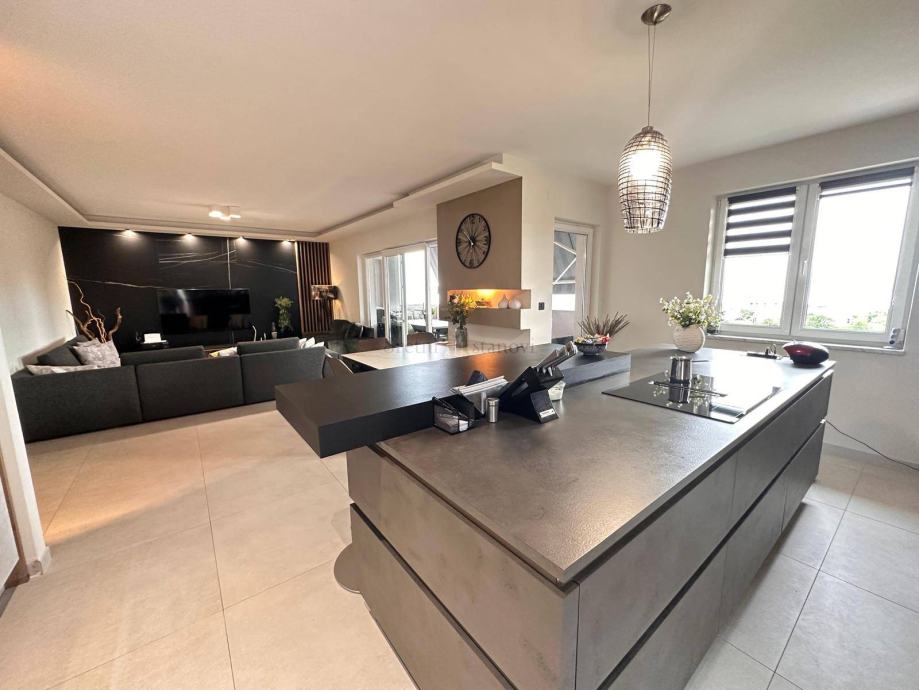 Ovaj luksuzni penthouse nalazi se na 2. etaži manje stambene zgrade iz 2002. godine, a potpuno je adaptiran 2022. godine. Stambenu površinu od 200,93 m2 čine 4 spavaće sobe, balkon, 2 kupaone i prostrani dnevni dio sa velikom lođom s koje se pruža otvoreni pogled na more i Kvarner. Stanu pripada prostorija u prizemlju površine 27 m2 te 2 vanjska parkirna mjesta. Prilikom adaptacije stana korišteni su najkvalitetniji materijali i oprema. U cijenu stana je uključen i sav ugradbeni namještaj sa luksuznom Nolte kuhinjom. Odlična termo izolacija te vrhunska aluminijska stolarija, pa je dovoljan jedan inverter smješten u dnevnom boravku za grijanje i hlađenje čitavog stana. Zgrada se nalazi u mirnoj slijepoj ulici na svega 6 km od centra Rijeke.
