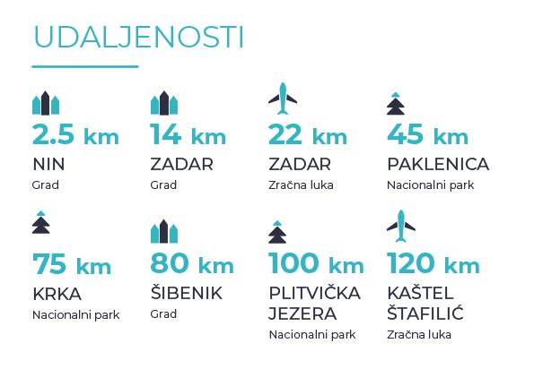 They are 14 km away from Zadar. Nearby is the town of Nin with the famous Nin mud, which has been used for health purposes from Roman times to the present day.