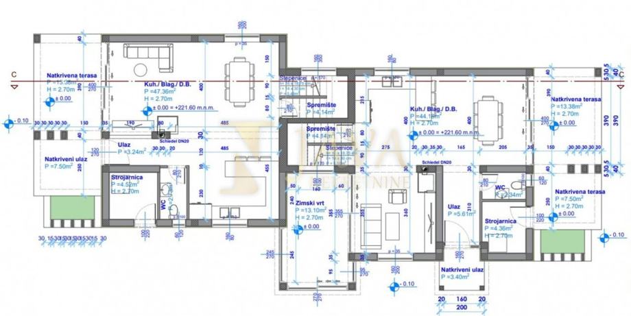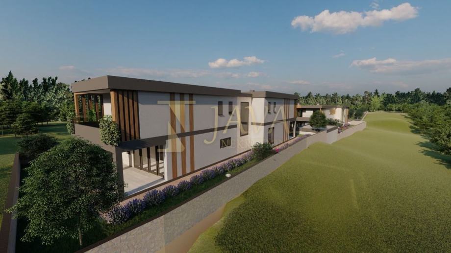 * Prizemlje svakog stana se sastoji od: natkrivenog ulaza, hodnika, toaleta, strojarnice, spremišta, open space dnevnog boravka s kuhinjom i blagovaonicom ( izlaz na prostranu natkrivenu terasu) te unutarnjih stepenica koje vode na kat