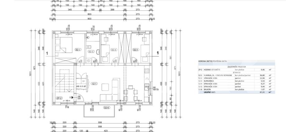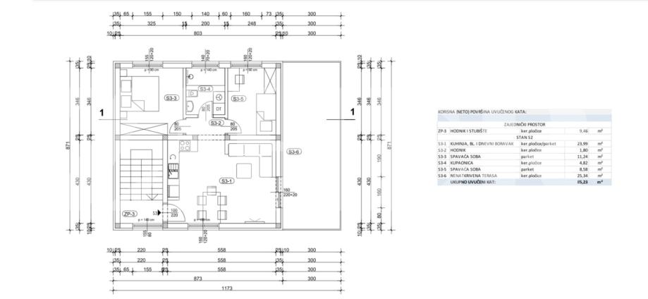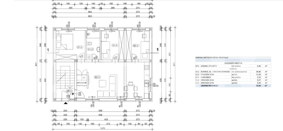 Stan S1 - sastoji se od hodnika, kupaonice, velikog dnevnog boravka sa kuhinjom i blagovaonicom, tri spavaće sobe (ukupne unutarnje površine 73 m2) te vrta (70 m2) i parkirnog mjesta. Ukupno obračunski 83 m2 - cijena 285.000 eura