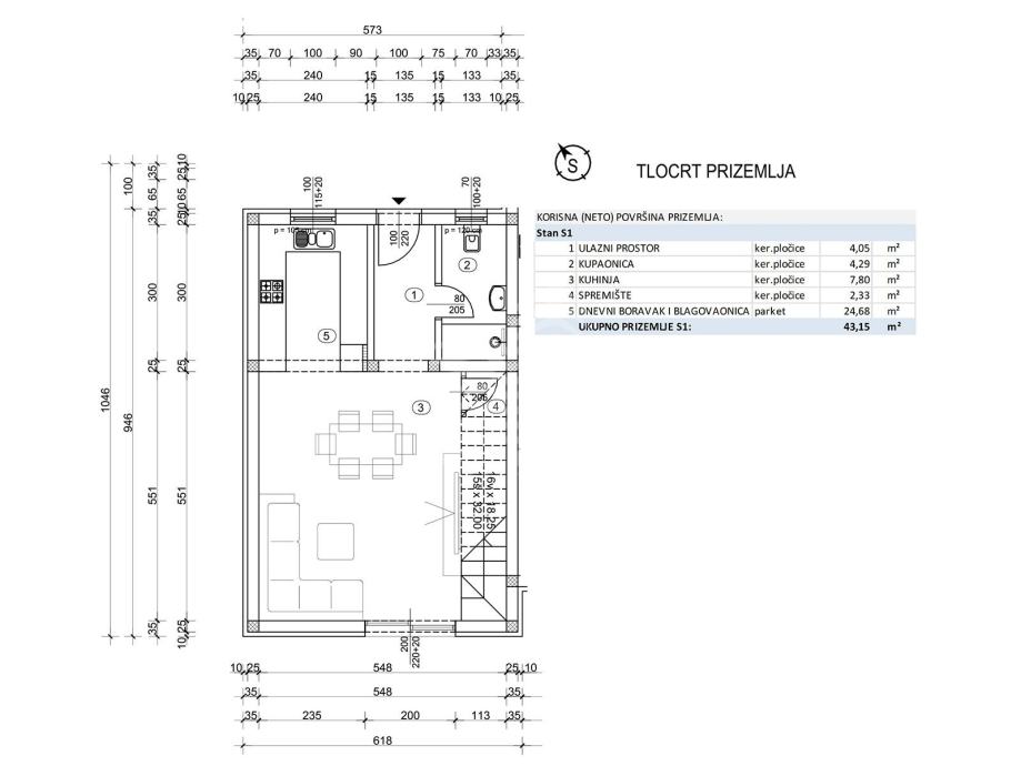 Prizemlja: ulaznog prostora (4m2), kupaonice (4.29m2), kuhinje (7,80m2), spremišta (2,33m2) i dnevnog boravka sa blagovaonicom (24,68m2). Ukupno 43,15 m2.