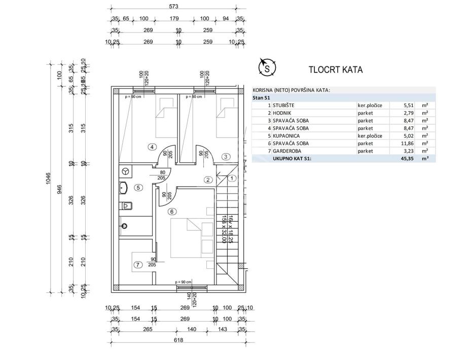 Kata: stubište (5,51m2), hodnik (2,79m2), spavaća soba (8,47m2), spavaća sobe (8,47m2), kupaonica (5,02m2), spavaća soba (11,86m2) i garderoba (3,23m2). Ukupno 45,35 m2.