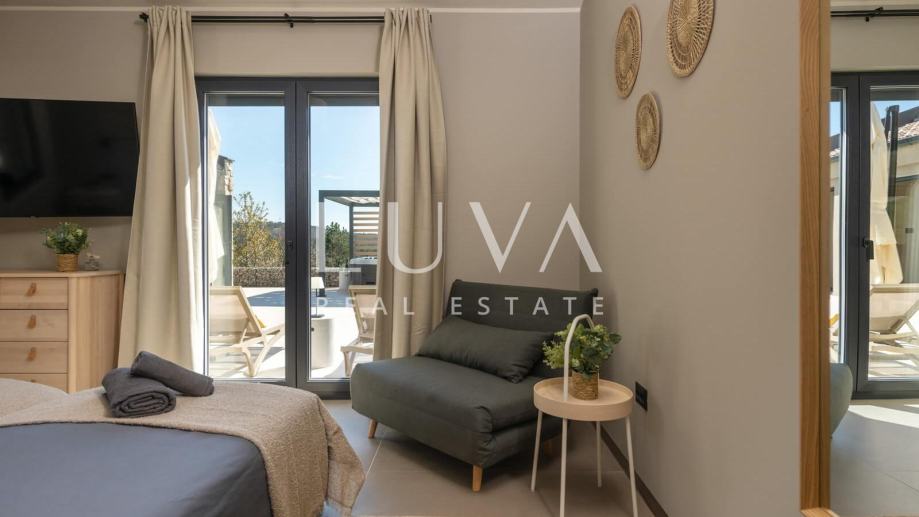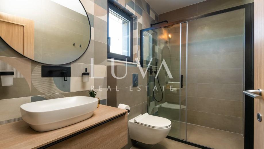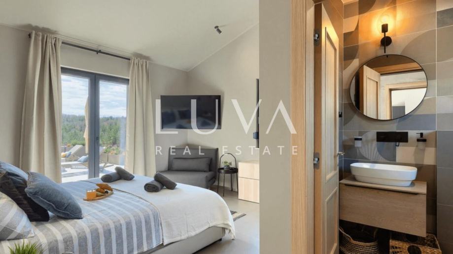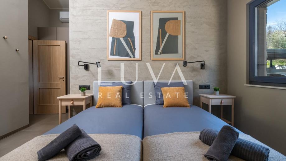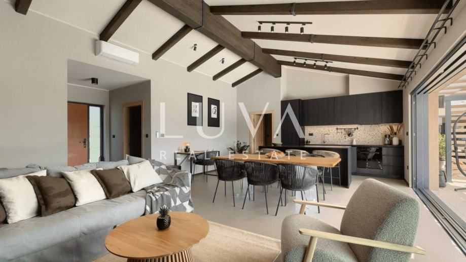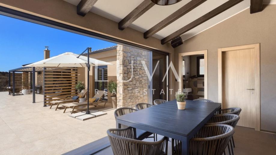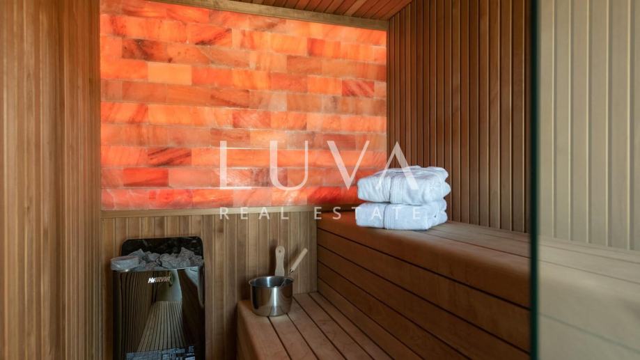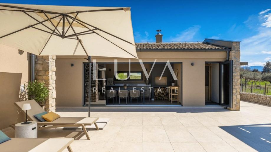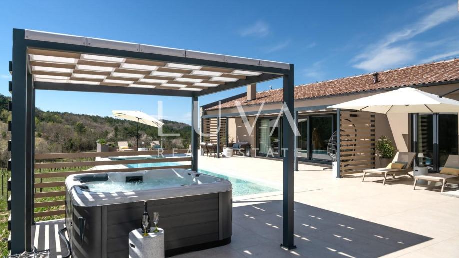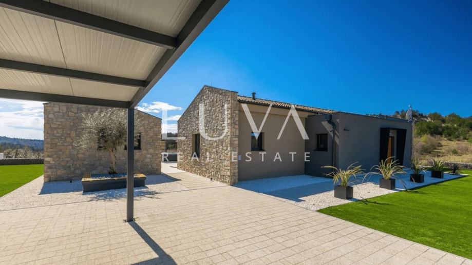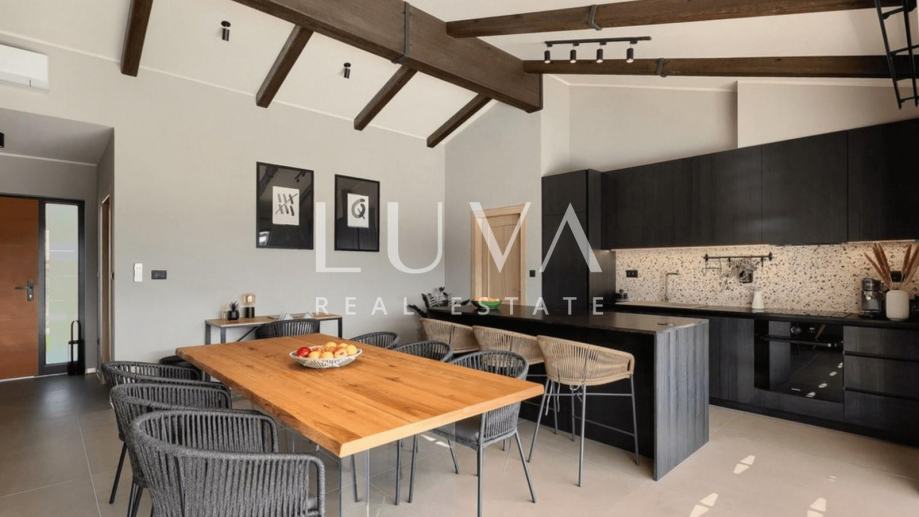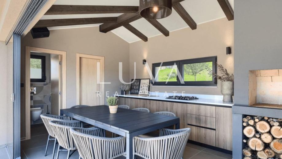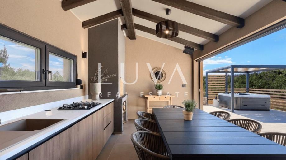 Kuća ima dodatnu natkrivenu vanjsku kuhinju s roštiljem i saunu unutar kuće, a ispred kuće se nalaze 2 natkrivena parking mjesta te punjač za električne aute.