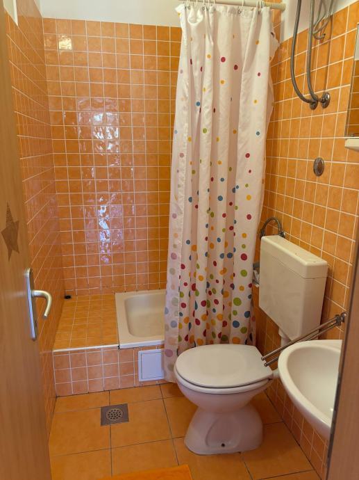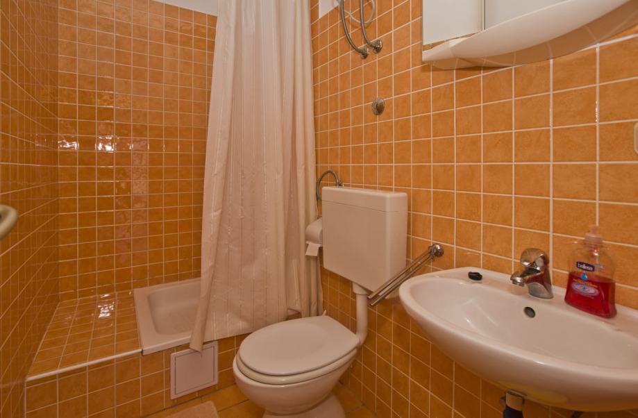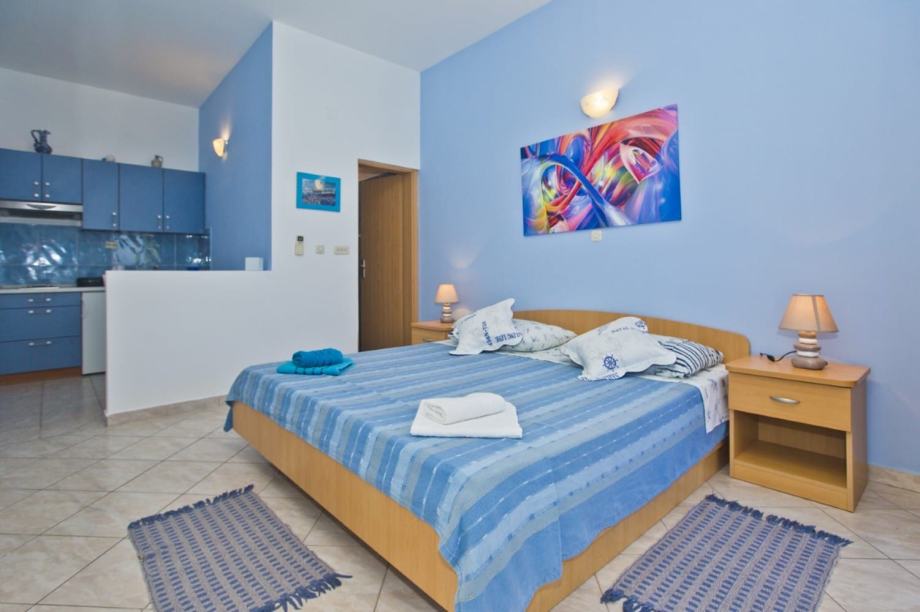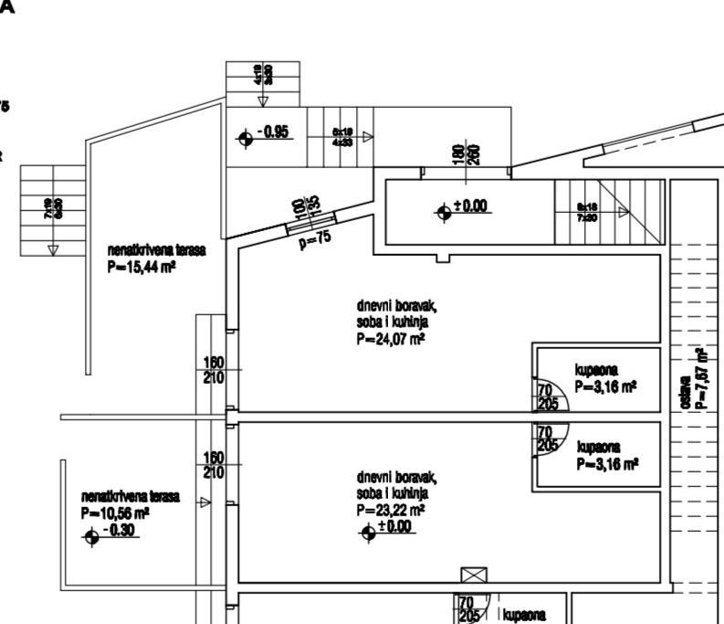 Prvi apartman se sastoji od jedne prostorije koja služi kao soba, dnevni boravak i kuhinja površine 24,07m2, kupaonice 3,16m2 i prostrane terase od 15,44m2.