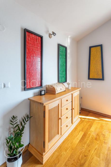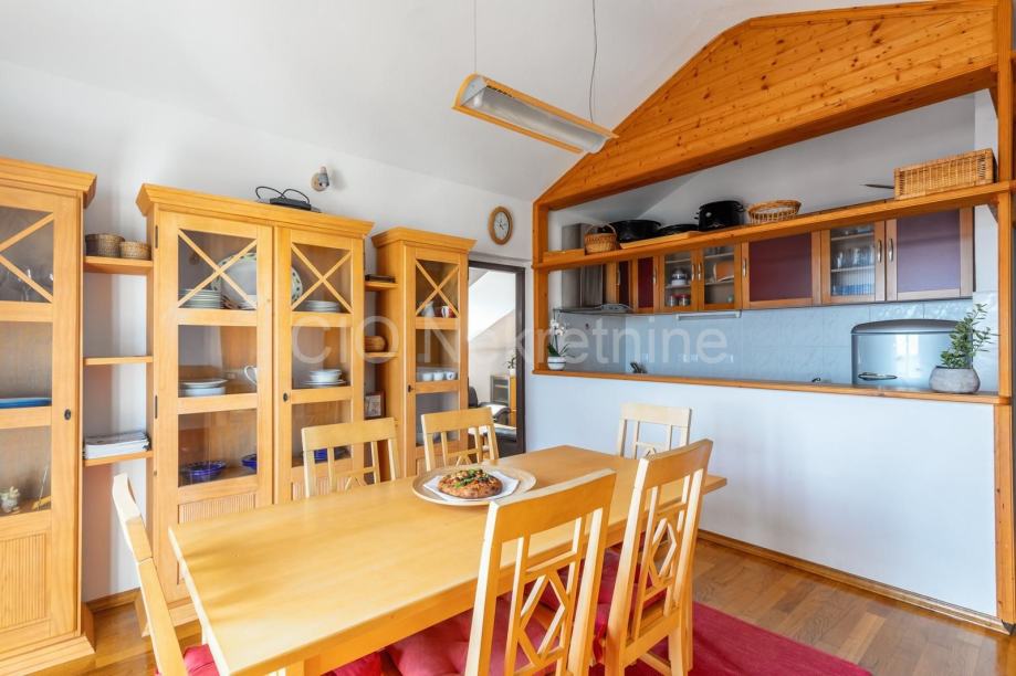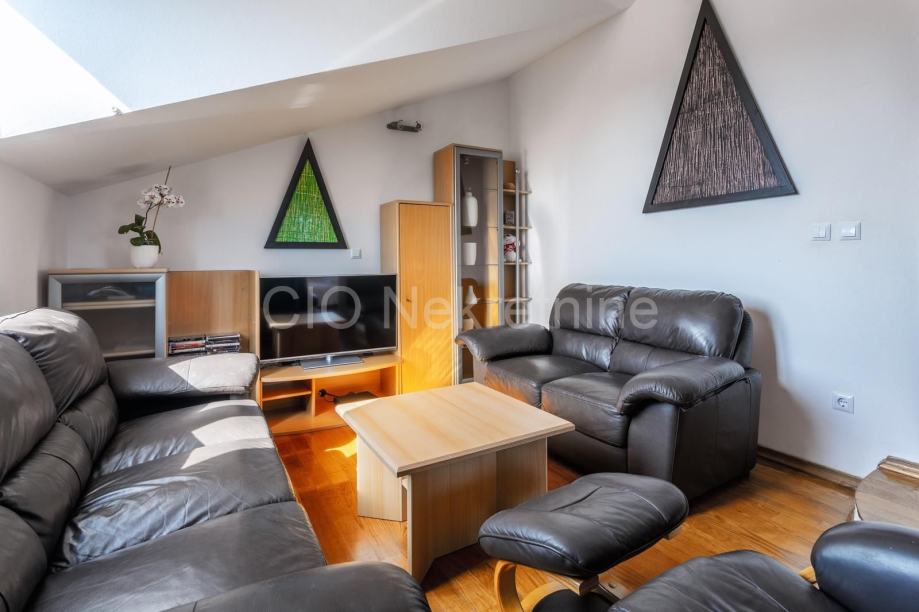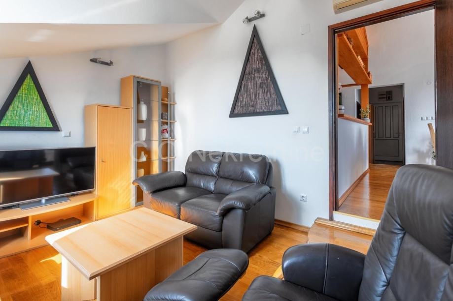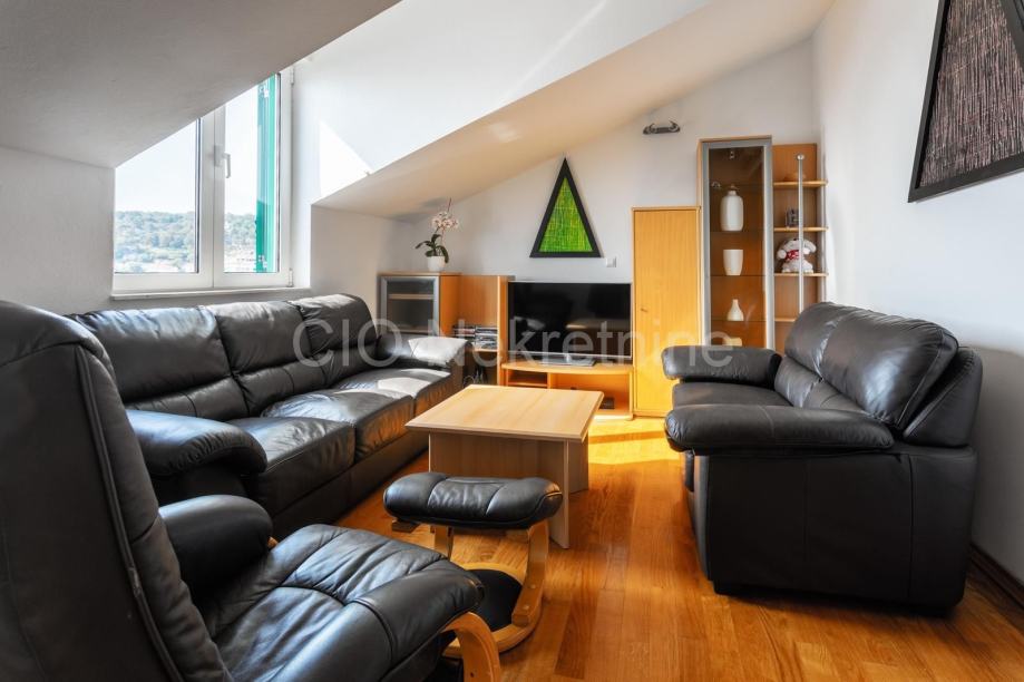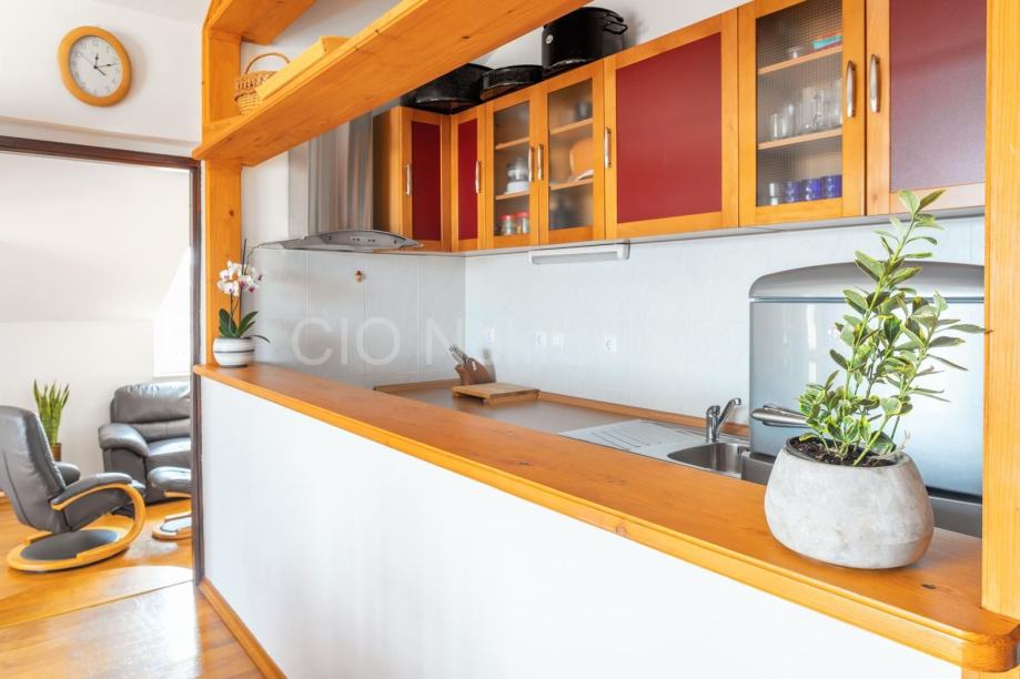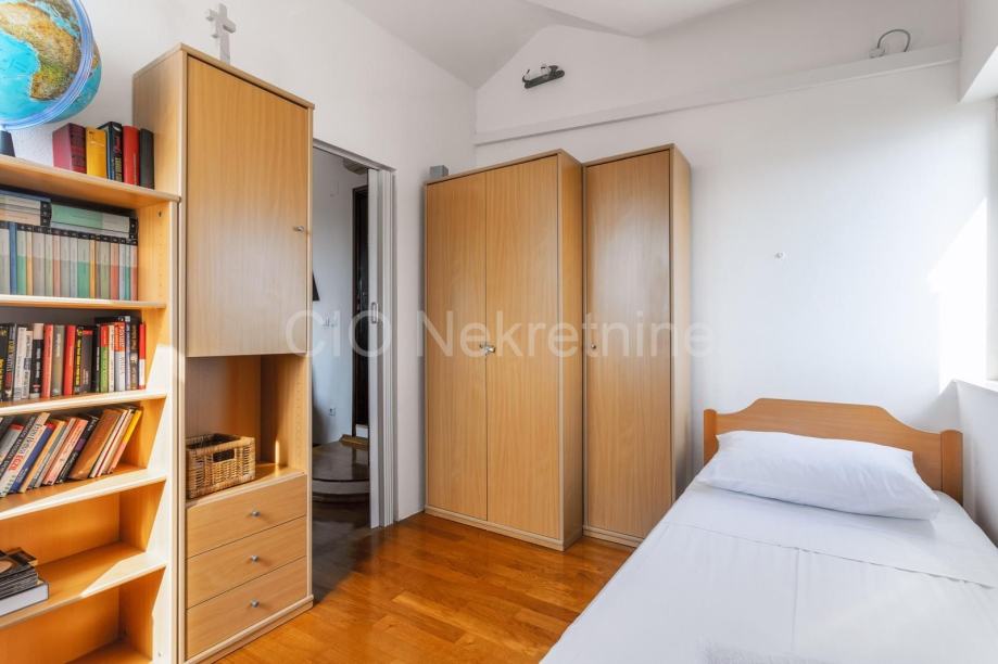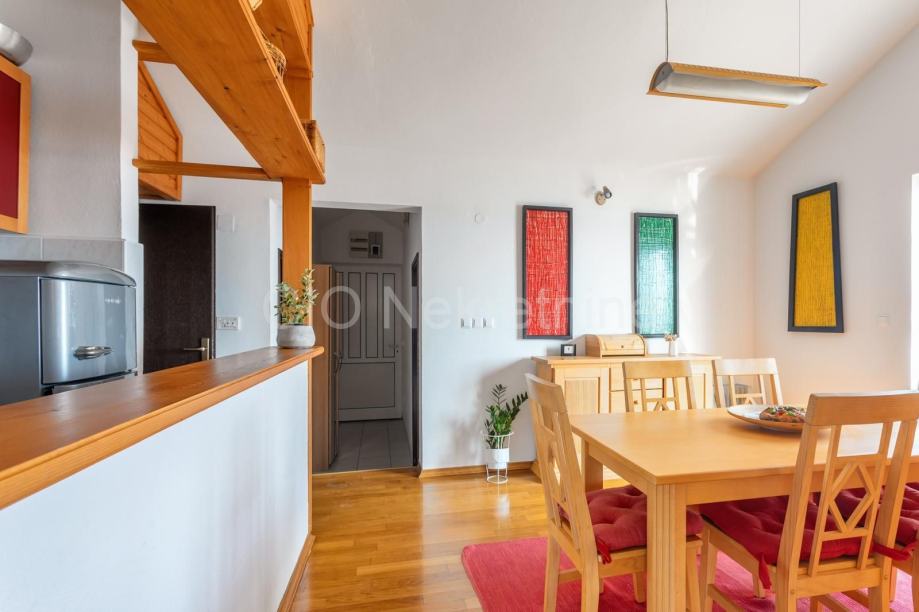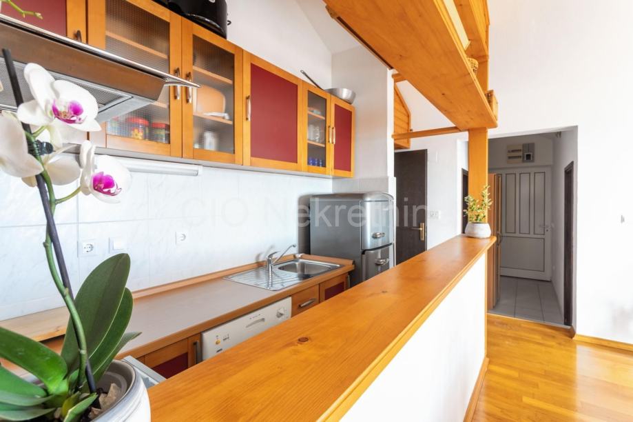 Stan je u naravi penthouse kojeg čine hodnik, tri sobe, kuhinja, blagovaonica, kupaonica i dnevni boravak. Također ima pripadajuće stepenište od 3,73 m2, balkon površine 3,77 m2 i prostranu terasu od 38,85 m2, što čini ukupnu površinu od 114,22 m2.
