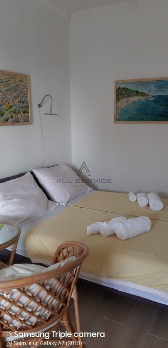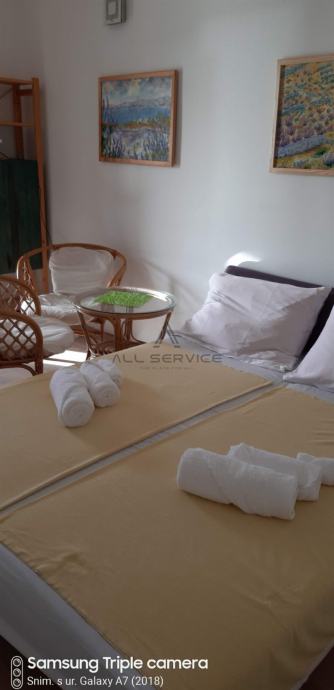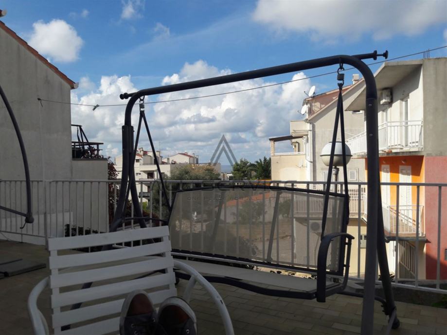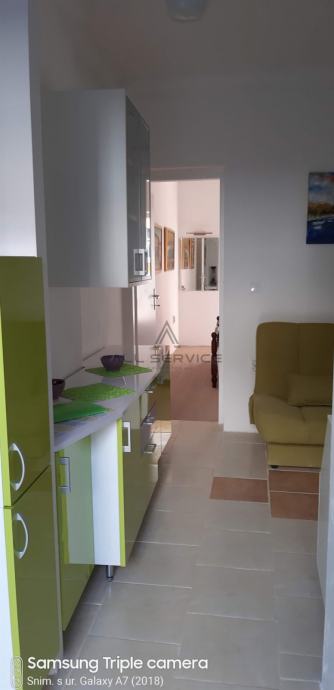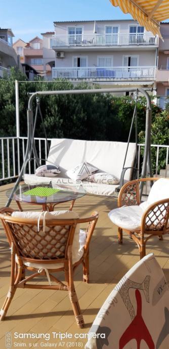 Stan se sastoji od dvije prostrane spavaće sobe (3x4 m), obje s izlazom na veliku terasu površine 30 m² s koje se pruža prekrasan pogled na more. Dnevni boravak, kuhinja i blagovaonica čine otvoreni, povezan prostor s podnim grijanjem na struju i direktnim izlazom u uređeni vrt površine cca 20 m², podijeljen u tri mediteranske “jerule”, savršen za opuštanje i druženje. U vrtu se nalazi i vanjski stol s dvije klupe.
