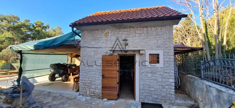 Kuća se sastoji od podruma, prizemlja i prvog kata. U prizemlju se nalazi dnevni boravak s kominom i kuhinjom, dok su na katu dvije spavaće sobe te kupaonica s WC-om. Ispred kuće uređeno je dvorište s bazenom i tri parkirna mjesta, što ovu nekretninu čini rijetkom prilikom na tržištu.