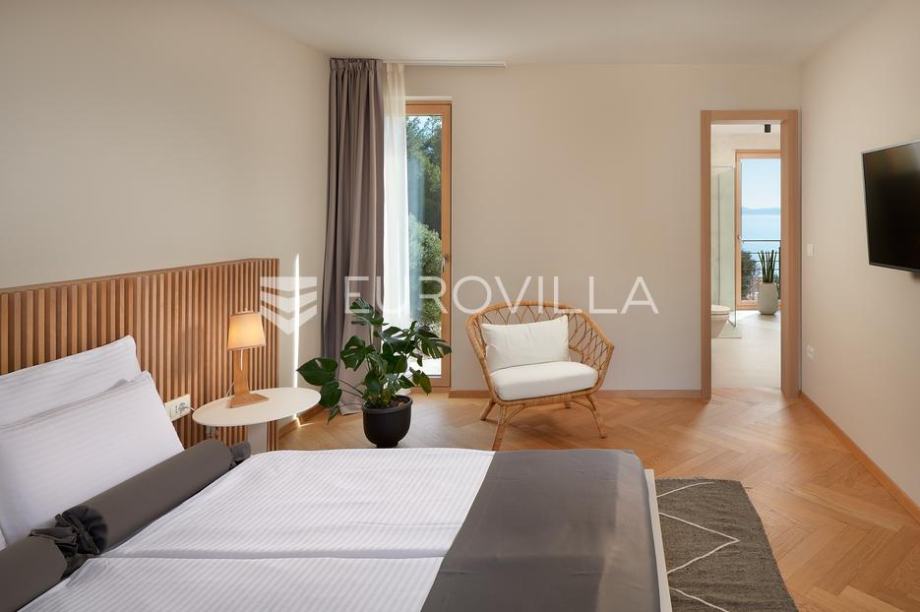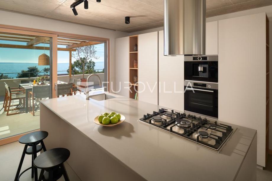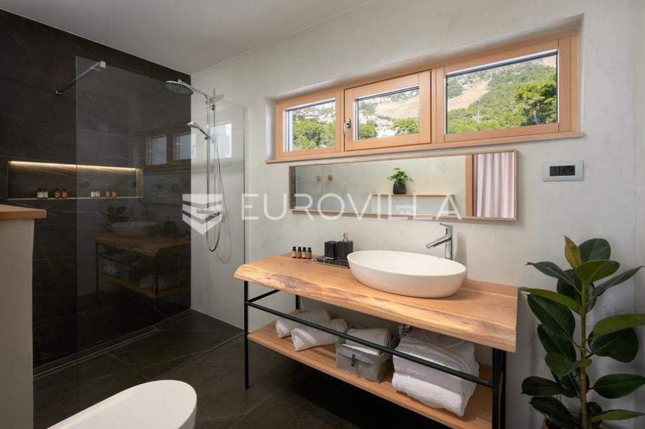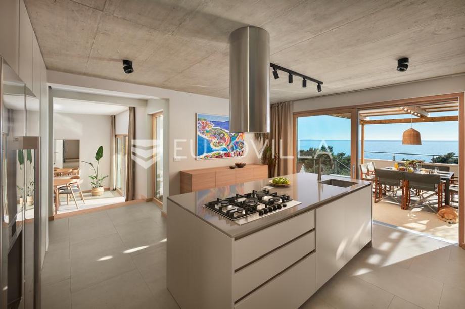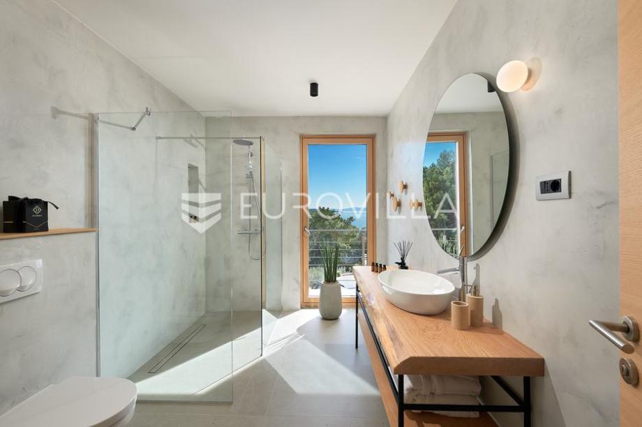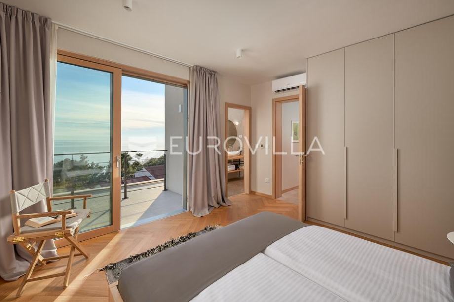 Prekrasna vila površine 240 m2 na zemljištu površine 500 m2 koja se prostire na tri etaže i uključuje četiri prostrane spavaće sobe s bračnim krevetima. Svaka soba ima vlastitu terasu s pogledom na more, a tu su i tri suvremeno uređene kupaonice s walk-in tuševima te dodatni toalet. U...