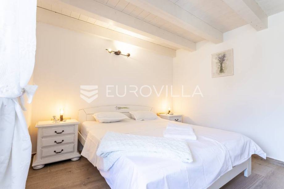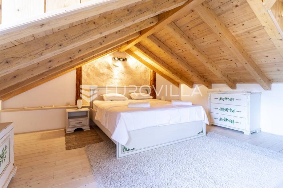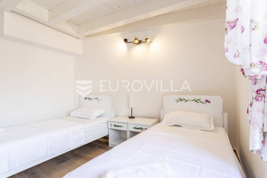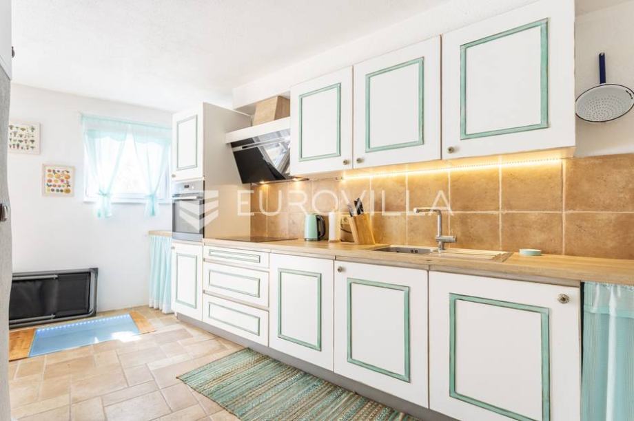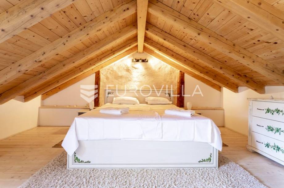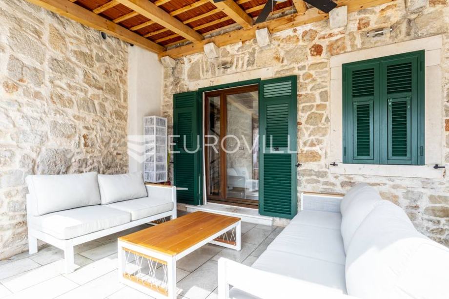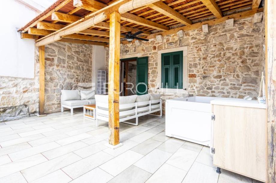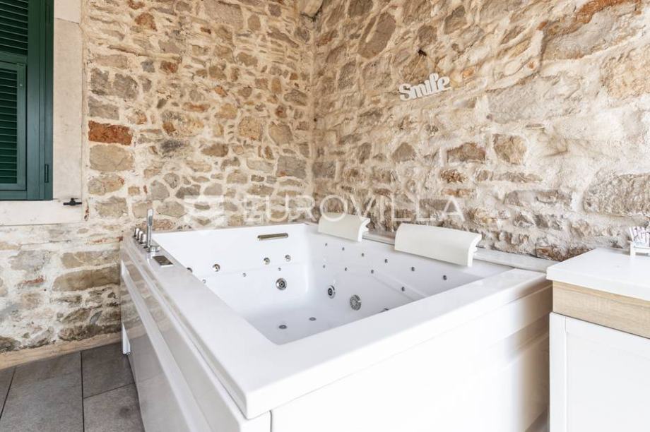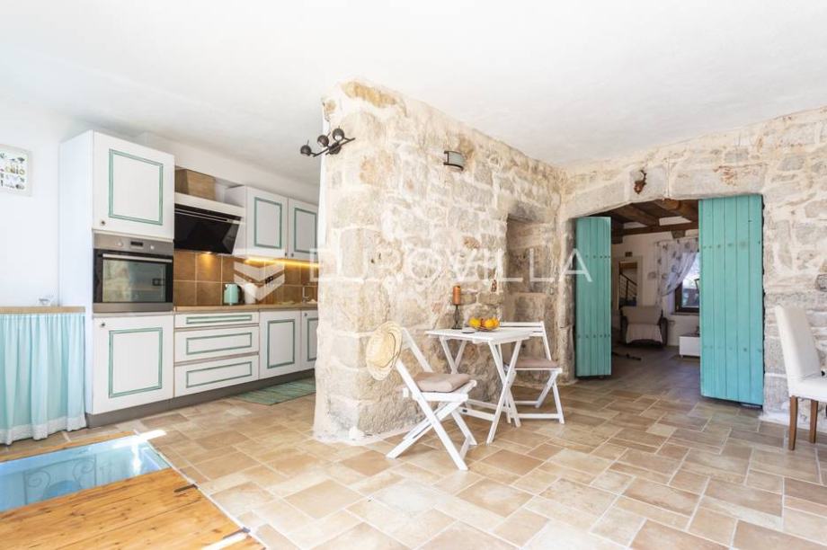 Kamena autohtona kuća s bazenom i jacuzzijem, smještena je u samom centru prekrasnog kamenog sela Vrbanj. Potpuno je renovirana u retro stilu, sa shabby chic detaljima, te je koncipirana kao mjesto za opuštanje i uživanje, iz koje, obzirom na njene sadržaje, ne trebate nikuda ići. Ili kao druga opcije može služiti kao početna točka za istraživanje okolnih šuma, plaža, uvala te prekrasnih domaćih jela i vina u mnogim autentičnim konobama.Vrbanj se nalazi u gotovo samom centru najsunčanijeg otoka na Jadranu, Hvara. Izvrsno je prometno povezan s Jelsom, Starim Gradom, Svetom Nedjeljom, Vrboskom, Zavalom, Hvarom i Sućurajem. Udaljen je svega 3 km od mora te se biciklom može doći za 15 minuta do Starog Grada ili 10 minuta do Jelse odnosno Vrboske.Ulaskom u dvorište Ville, ispod kamenog starinskog volta, s lijeve strane dočekat će vas veliki bazen. U nastavku ćete doći do dvije cjeline za odmor, lounge zone za opuštanje pored bazena i prostora s ručno rađenim kaminom i drvenom nadstrešnicom za druženja s prijateljima.U prizemlju unutar kuće ulazi se u prostor za blagovanje s velikim drvenim stolom za 6 osoba i ručno rađenim bakrenim ogledalom. Odmah do blagovaone je kuhinja u retro stilu. U dnevni boravak se ulazi kroz stara tirkizna drvena vrata te ćete se naći u kamenom prostranom dnevnom boravku sa starinski uređenim namještajem u shabby chic stilu. U sklopu dnevnog boravka nalazi se gostinjski wc uređen u istom stilu.Iz prizemlja, pored blagovaone, kroz otvor u podu, vode stepenice u oazu morskih dubina. Stara gustirna je u potpunosti prilagođena odmoru za dušu i tijelo, dajući nevjerojatan osjećaj mira i spokoja.Na 1. katu se nalaze 2 spavaće sobe i kupaonica, te prostrana terasa s jacuzzijem i mini kuhinjom, te lounge zonom. Prva soba je Oleander room s dva odvojena kreveta i ručno ukrašenim ormarima, noćnim ormarićima te uzglavljima kreveta u oleandar stilu. Također su i ručno šivene zavjese cvjetnog uzorka koji daju dašak otmjenosti Oleander room-u. Druga spavaća soba je Lavander room s bračnim krevetom 180* 200, noćnim ormarićima i ormarom, sve sa sitnim detaljima Lavande.Na 2. katu se nalazi najveća spavaća soba (Olive room) s walk-in kupaonicom. I pod i strop su drveni, te je prisutan osjećaj planinske kolibe, ali sa daškom Mediterana obzirom na uzorak masline ručno oslikan na krevetu, komodi te velikoj drvenoj kutiji za stvari.To je ujedno i priča ove Vile, koja vas vodi od morskih dubina do planinskih vrhova, kako god se vi željeli osjećati.Ova Villa je potpuno opremljena i prodaje se s namještajem. Svaka soba ima klimu, a u dnevnom boravku te Dive & Relax zoni klimatizacija tijekom ljeta nije potrebna obzirom da kamen kuće prirodno drži nižu temperaturu od one vanjske. Svaki detalj ove Vile smo osmislili s ljubavlju i pažnjom i sigurni smo da će to prepoznati i budući vlasnici.Za sva ostala pitanja, stojim na raspolaganju....