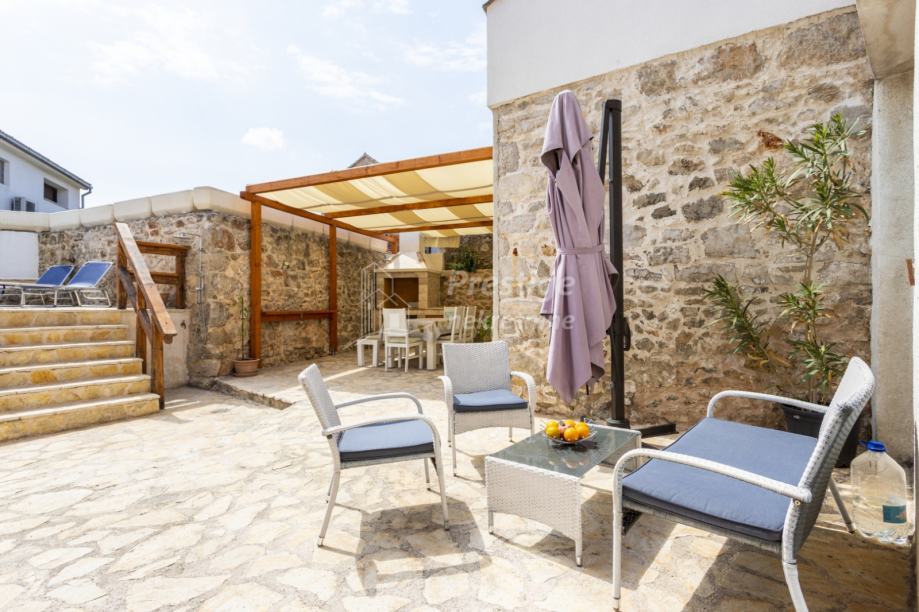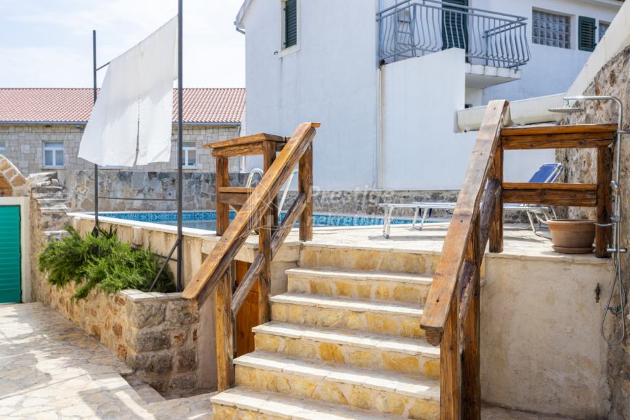 Ulaskom u dvorište Ville, ispod kamenog starinskog volta, s lijeve strane dočekat će vas veliki bazen. U nastavku ćete doći do dvije cjeline za odmor, lounge zone za opuštanje pored bazena i prostora s ručno rađenim kaminom i drvenom nadstrešnicom za druženja s prijateljima.