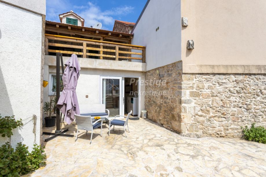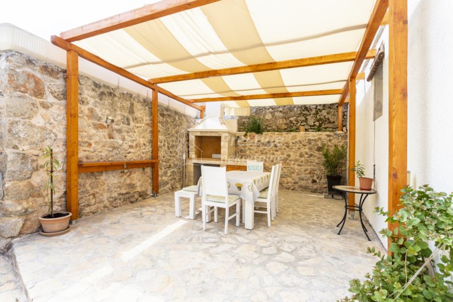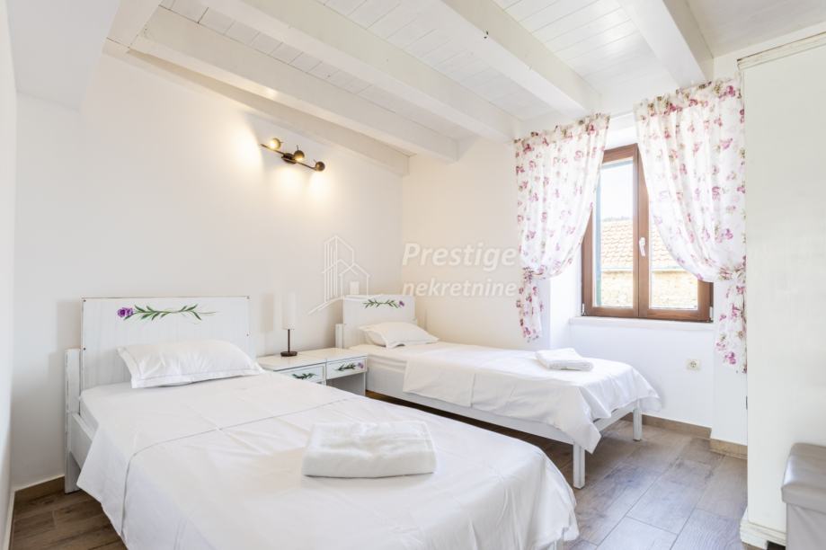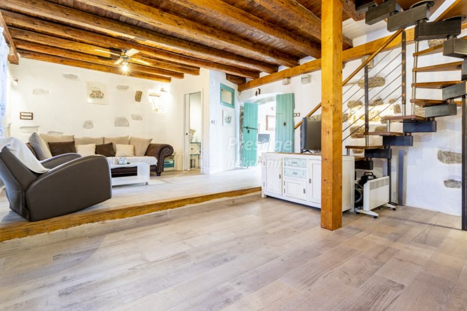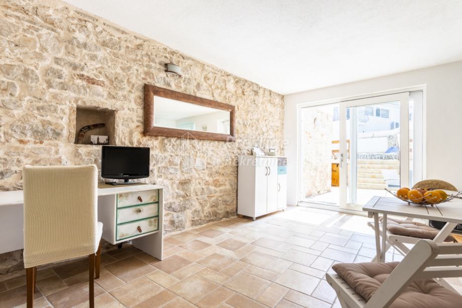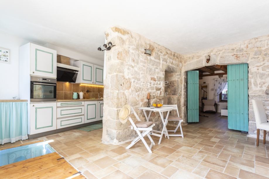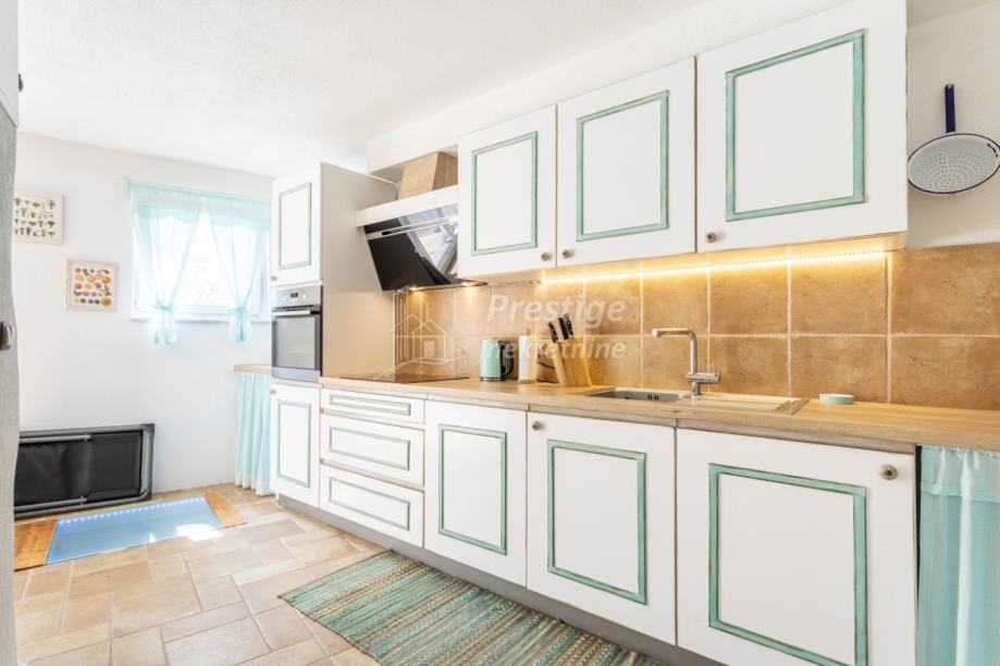 U prizemlju unutar kuće ulazi se u prostor za blagovanje s velikim drvenim stolom za 6 osoba i ručno rađenim bakrenim ogledalom. Odmah do blagovaone je kuhinja u retro stilu. U dnevni boravak se ulazi kroz stara tirkizna drvena vrata te ćete se naći u kamenom prostranom dnevnom boravku sa starinski uređenim namještajem u shabby chic stilu. U sklopu dnevnog boravka nalazi se gostinjski wc uređen u istom stilu.