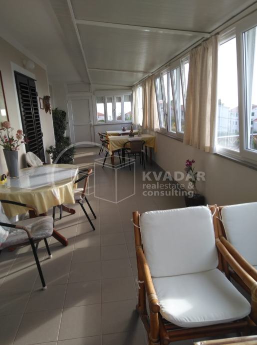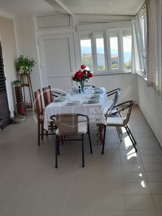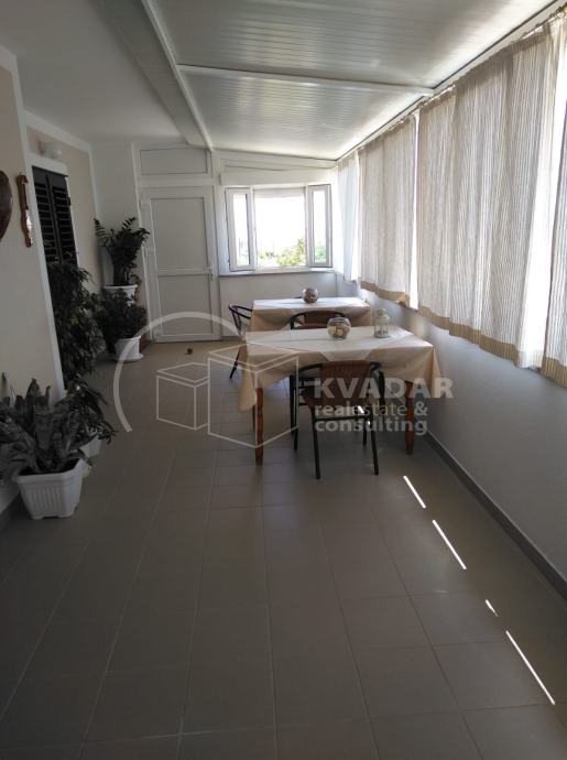 The apartment on the first floor, with a total square footage of 142m2, contains 4 bedrooms, 3 bathroom and toilet, kitchen with dining and living room, and has an exit to the loggia from which there is a beautiful view of the sea and the surrounding area.