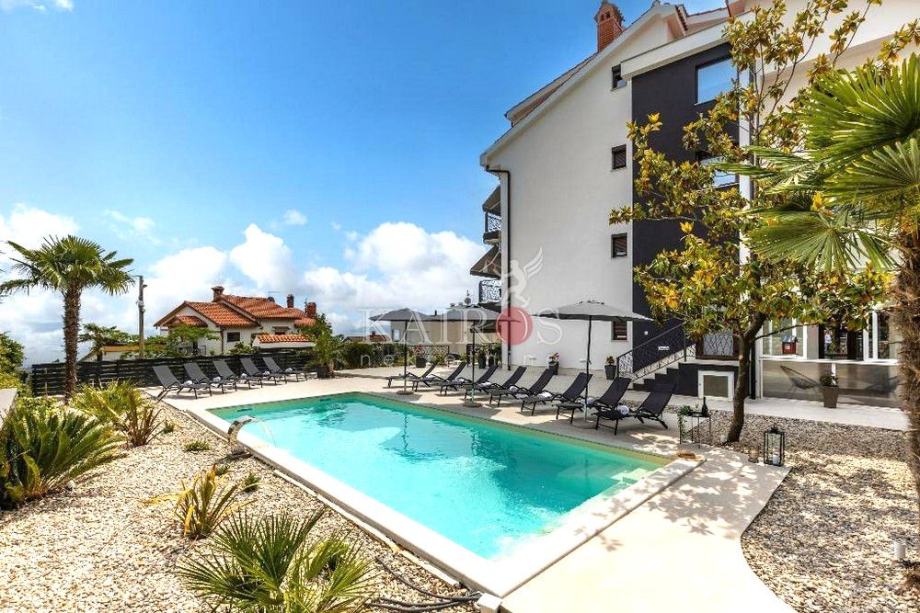 IČIĆI, iznajmljujemo moderno i lijepo uređen stan na 1. katu kuće s ograđenom okućnicom i bazenom. Stan je kompletno moderno i lijepo uređen i opremljen, ima 2 kupaonice od koji je jedna "en suite", ima 2 balkona s prekrasnim panoramskim pogledom na more. Vlastiti parking.