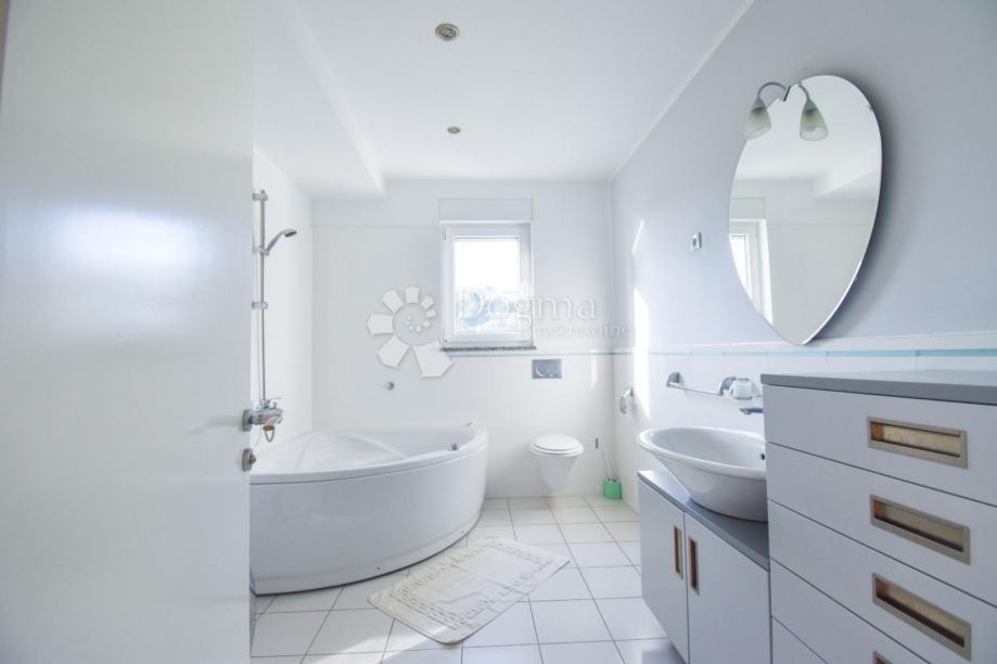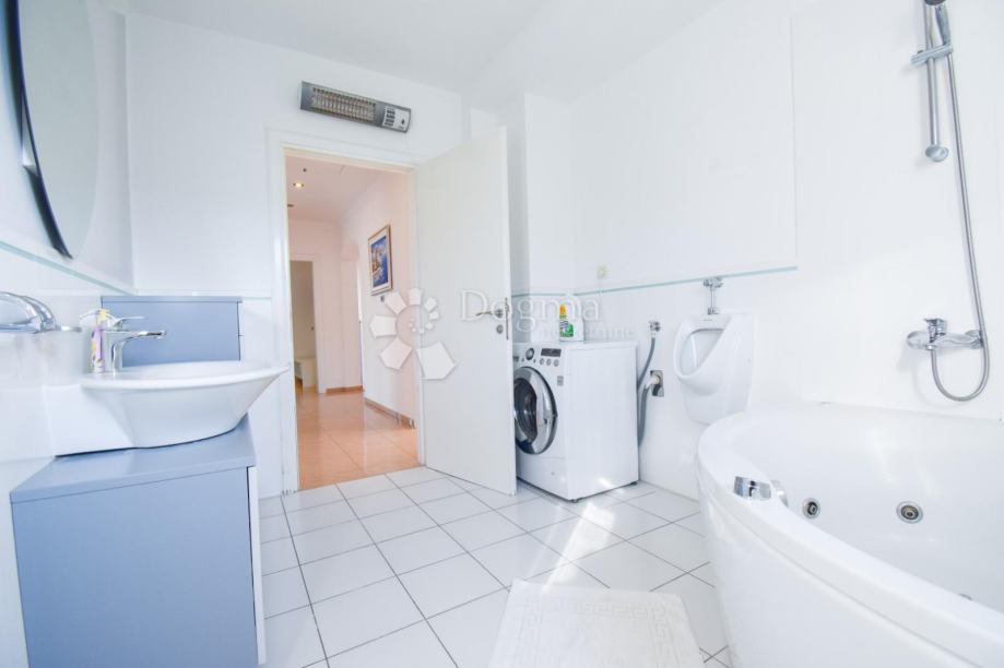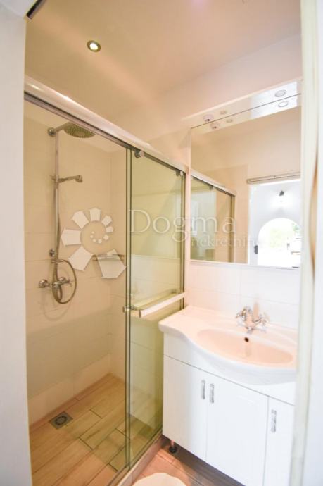 Ulazeći u stan, dočekuje vas prostrani dnevni boravak koji se savršeno integrira s kuhinjom i blagovaonicom, stvarajući srce doma. Svijetlo, otvoreno i prozračno okruženje pruža ugodan doživljaj prostora. Uz tri spavaće sobe, ovaj stan je dizajniran kako bi zadovoljio potrebe svake porodice. Jedna spavaća soba ima vlastitu kupaonicu, pružajući intimnost i udobnost. Druga soba izlazi na prostranu lođu s predivnim pogledom na more. Treća soba s dva manja kreveta savršena je za goste ili mlađe članove obitelji. Osim unutrašnjosti, stan obuhvaća dodatne prostore koji čine ovu nekretninu posebnom. Tavan površine 128 m2 pruža dodatni prostor za skladištenje ili kreativnu transformaciju. Dvorišna konoba od 40 m2, uređena kao samostalni apartman, dodatno obogaćuje ovo već fantastično stambeno iskustvo.