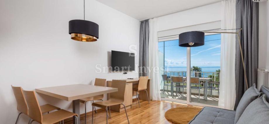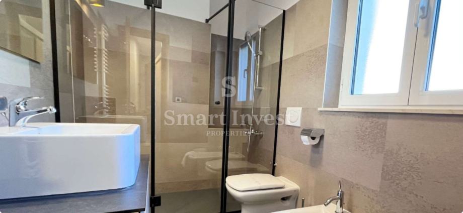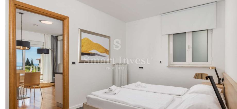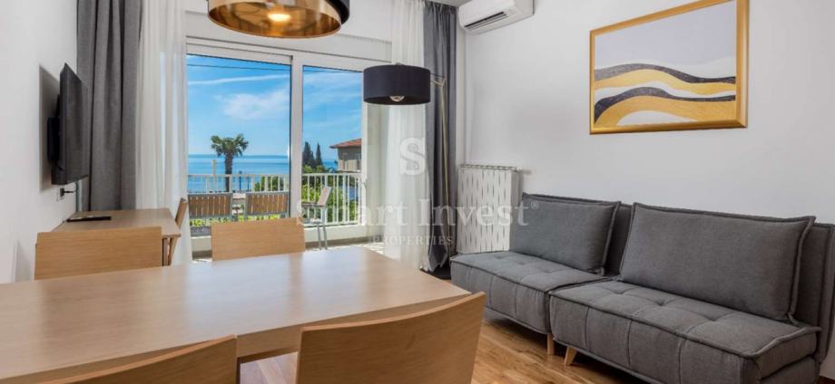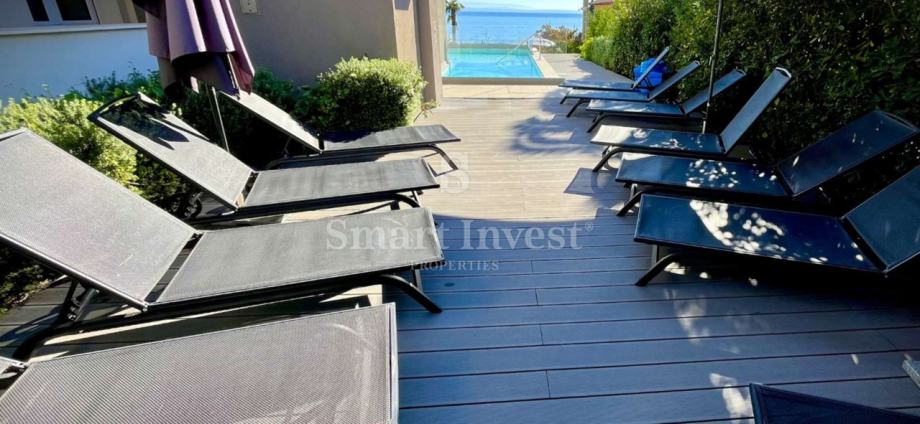 Dugoročno se iznajmljuje moderan, luksuzno opremljen i namješten stan u višestambenoj zgradi s dizalom i bazenom, na prekrasnoj lokaciji uz more.