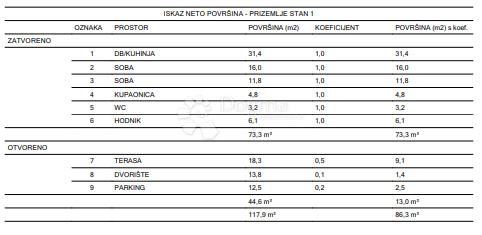 Na prodaju je moderan stan S1 u prizemlju kvalitetne novogradnje, neto površine 86,30 m², koji u potpunosti zadovoljava suvremene standarde stanovanja. Ova nekretnina predstavlja idealan izbor za kupce koji traže funkcionalan raspored, visoku kvalitetu gradnje i dodatnu vrijednost u obliku vlastitog vanjskog prostora.