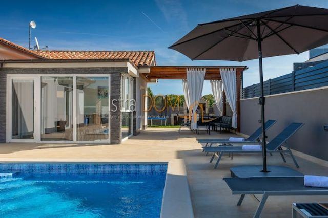 Prodajemo modernu prizemnicu s bazenom koja nudi udoban i elegantan životni prostor. Ulazni hodnik vodi vas u prostranu kuhinju, blagovaonicu i dnevni boravak, idealno mjesto za obiteljska okupljanja ili druženje s prijateljima. Tri udobne spavaće sobe i dvije kupaonice pružaju privatnost i udobnost za cijelu obitelj. Iz dnevnog boravka izlazi se na natkrivenu i zatvorenu terasu s prekrasnim pogledom na bazen, pružajući miran kutak za opuštanje i uživanje. Pored terase, prostrani bazen s sunčalištem poziva na osvježenje i relaksaciju. Dodatno, kuća uključuje garažu i skladište, pružajući praktičnost i dovoljno prostora za pohranu. Okućnica je ograđena i ukrašena maslinama, a tu je i dovoljno parkirnih mjesta za tri automobila, pružajući sigurnost i udobnost za svakodnevni život. Praonica je opremljena svim potrebnim sadržajem, uključujući perilicu rublja, dok dodatna blagovaonica sa roštiljem na terasi nudi mogućnost za uživanje u vanjskim aktivnostima i druženju s obitelji i prijateljima. Ova moderna prizemnica s bazenom pruža savršen spoj udobnosti, stila i funkcionalnosti za kvalitetan životni stil.