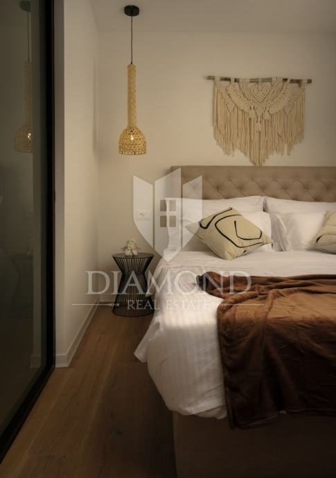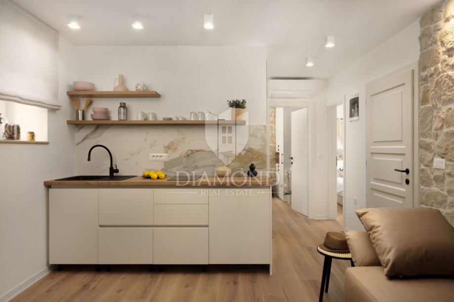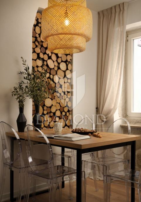 Ovaj stan nalazi se na drugome katu renovirane zgrade te se prostire na 50m2. Stanom dominira open space prostor gdje se nalaze dnevni boravak, kuhinja i blagovaonica dok u ostatku stana se nalaze dvije spavaće sobe i kupaonica. Na podestu kod ulaza u stan nalazi se veliki ugradbeni ormar kao dodatni prostor za skladištenje stvari.
