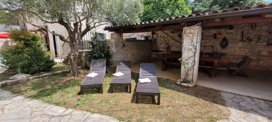 Dvorište je zajedničko za veću i manju kuću, a u njemu se nalaze bazen, vanjski solarni tuš, sunčalište kao i natkrivena ljetna kuhinja. U dvorištu se nalazi nekoliko maslina i dekorativno bilje. Kroz vrt je postavljeno automatsko navodnjavanje.