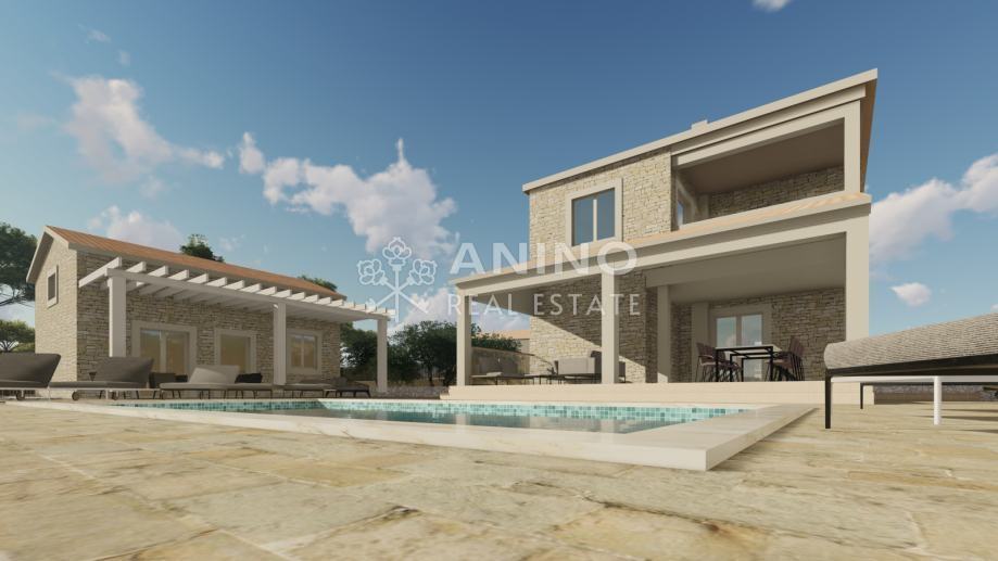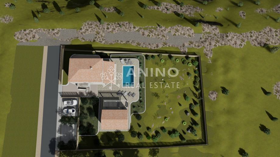 Na prodaju je kuća u izgradnji s dvije odvojene stambene jedinice, smještena na rubu građevinske zone, na mirnoj i atraktivnoj lokaciji. Ukupna stambena površina iznosi 250 m², a kuća se nalazi na velikom zemljištu od 1817 m², s pravomoćnom građevinskom dozvolom za izgradnju samostojeće kuće i pomoćnog objekta.