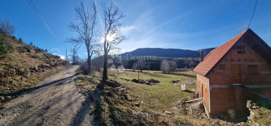 Prodajemo u centru Velebita, park prirode. imanje od 7500 m² od toga polovica je građevinsko. Na imanju se nalaze tri postojeća temelja od čega je na jednom započeta gradnja kuće. Stavljena je pod krov, postavljena je stolarija, u prizemlju je postavljena instalacija struje i vode te razvučen betonska podloga za pločice. Prvi kat i potkrovlje su neuređeni.