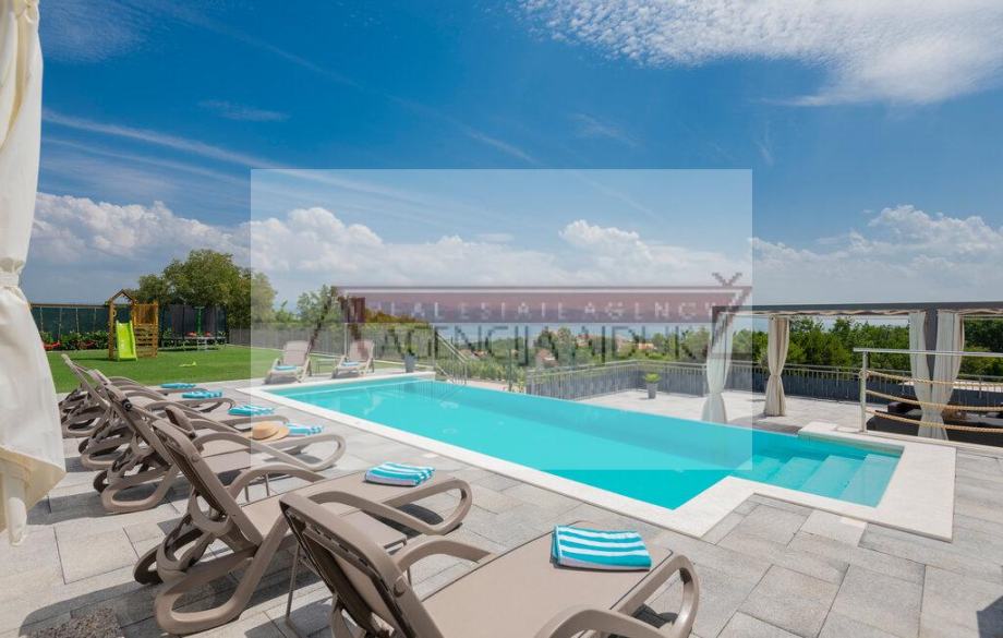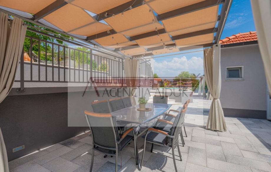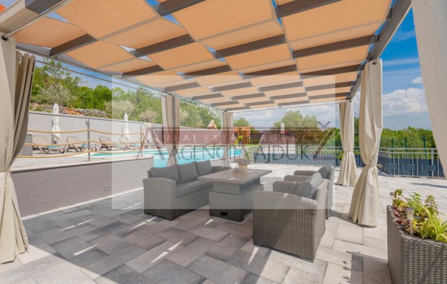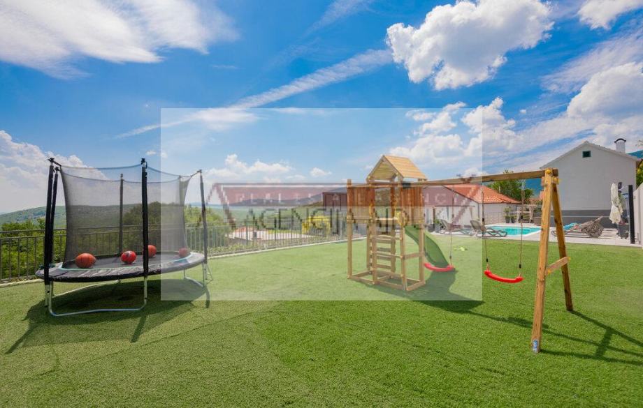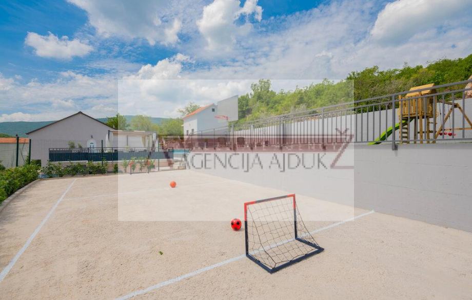 Dnevni boravak je direktno povezan sa uređenim dvorištem gdje se nalazi bazen od 40 m2, dvije nastrešnice, dječje igralište, prostor za opuštenje i zabavu te pomoćni objekt (roštilj).