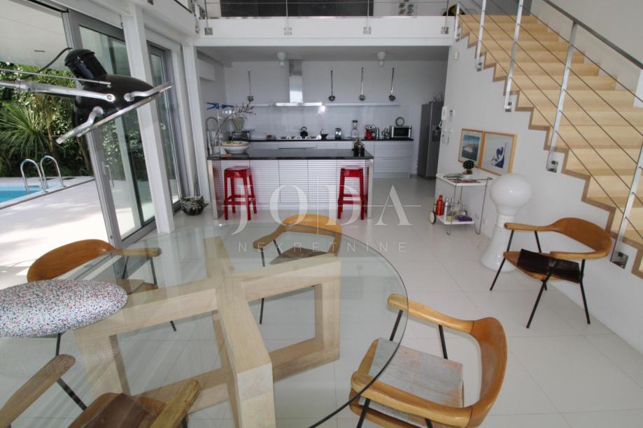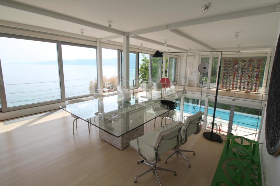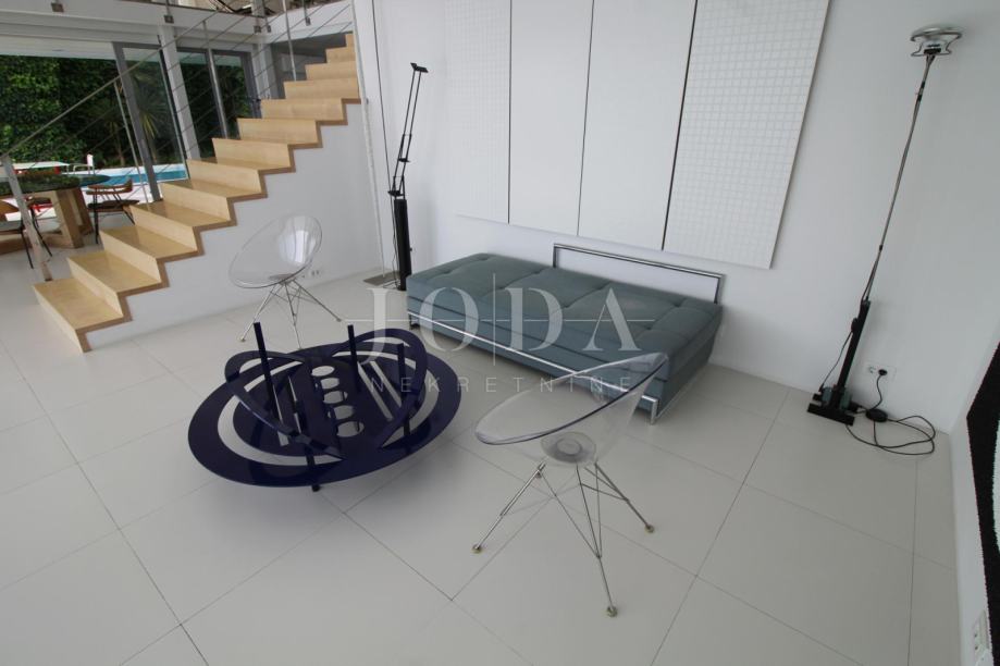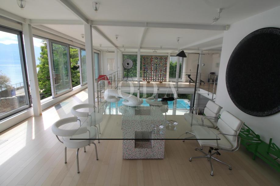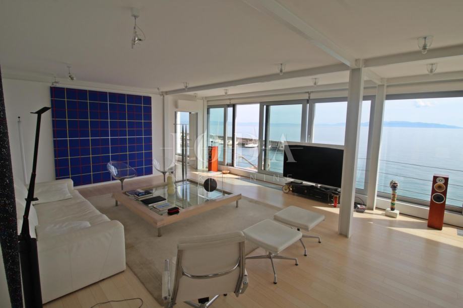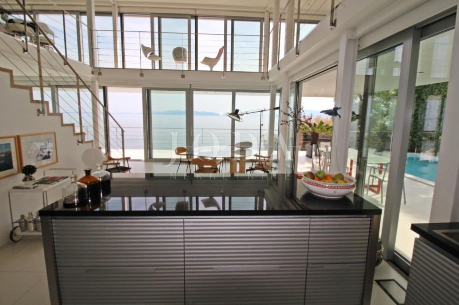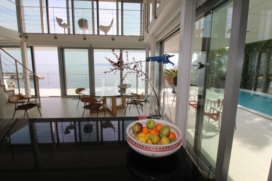 Rijeka, samo 5 m od mora prodaje se dizajnerska villa na tri etaže. Villa je izgrađena 2011 g. na parceli od 630 m2 i svojom otvorenošću prema moru i komunikacijom prostora smatra se jednom od najljepših villa na Jadranu. Villu je dizajnirao poznati arhitekt Idis Turato, a unutarnje uređenje je zasluga vlasnika. Ulaz je sa drugog kata koji je ujedno i jedna otvorena dnevna zona. Na drugom katu se nalaze još dvije spavaće sobe svaka sa svojom vlastitom kupaonom. Unutarnje stepenice i lift povezuju svaku etažu ville. Na prvom katu se nalazi kuhinja, blagovaona, gostinjski toalet i master spavaća soba sa walk in garderobom i vlastitom kupaonom. Cijela etaža ima izlaz na prostrane terase koje ju okružuju. Na srednjoj etaži se nalazi i bazen dimenzija 4*11 m2 i vanjska natkrivena lounge zona. U prizemlju se nalazi atelje vlasnika, a također ima izlaz na prostranu terasu. Ova autentična nekretnina ima vrhunsku opremu, klimatizacijski sustav Daikin (grijanje i hlađenje), 4 vanjske jedinice i 11 unutarnjih klima uređaja, sistem solarnog dogrijavanja bazena i sanitarne tople vode, centralno plinsko grijanje svake etaže, aluminijska stolarija SCHICO 70 (dupla stakla), alarmni sustav i portafon. Villa ima iza kuće okućnicu na kojoj je parking za tri vozila, a ulaz na okućnicu je ograđen na daljinsko upravljanje. U dogovoru sa vlasnikom može se prodati i dizajnerski namještaj.