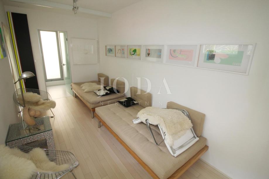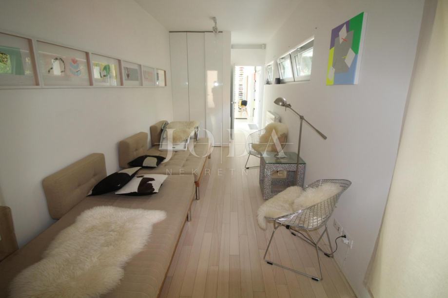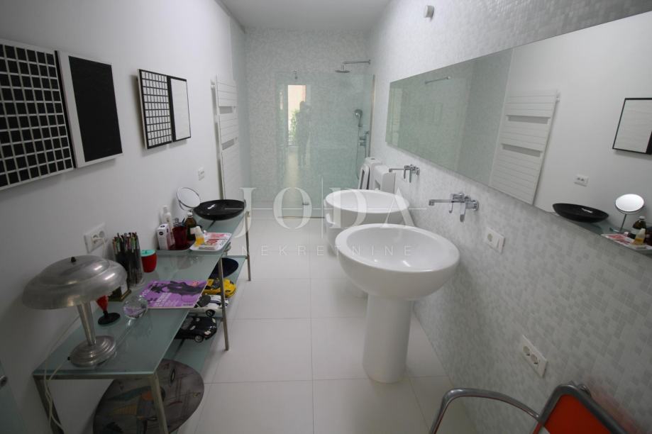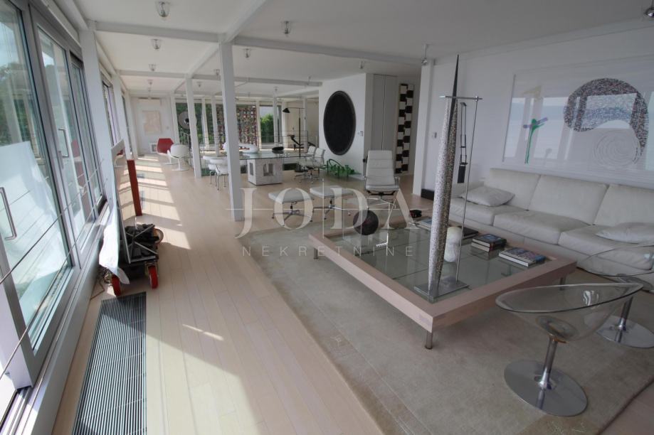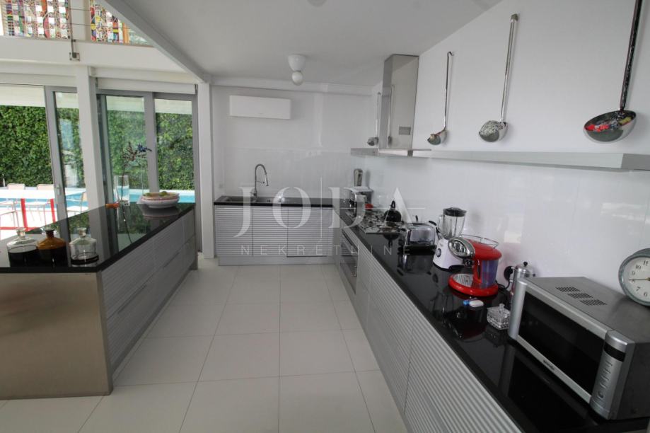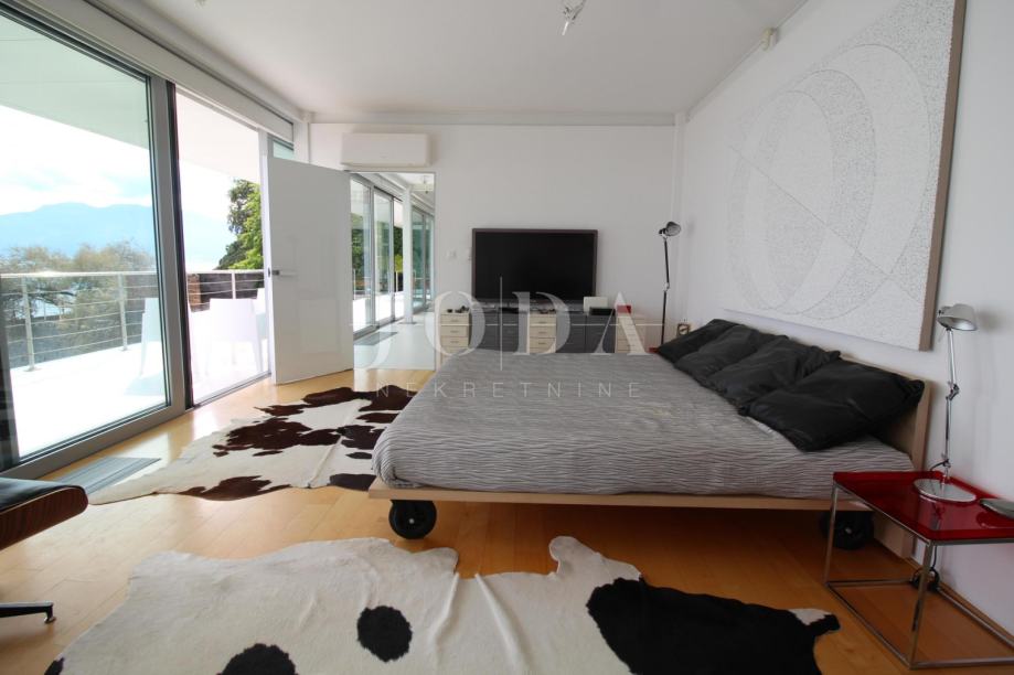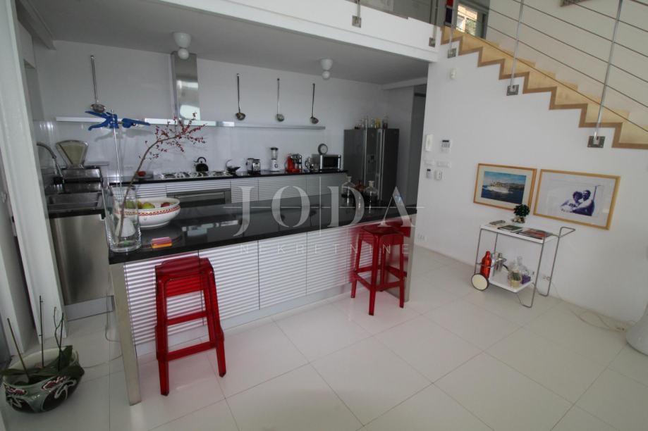 Rijeka, samo 5 m od mora prodaje se dizajnerska villa na tri etaže. Villa je izgrađena 2011 g. na parceli od 630 m2 i svojom otvorenošću prema moru i komunikacijom prostora smatra se jednom od najljepših villa na Jadranu. Villu je dizajnirao poznati arhitekt Idis Turato, a unutarnje uređenje je zasluga vlasnika. Ulaz je sa drugog kata koji je ujedno i jedna otvorena dnevna zona. Na drugom katu se nalaze još dvije spavaće sobe svaka sa svojom vlastitom kupaonom. Unutarnje stepenice i lift povezuju svaku etažu ville. Na prvom katu se nalazi kuhinja, blagovaona, gostinjski toalet i master spavaća soba sa walk in garderobom i vlastitom kupaonom. Cijela etaža ima izlaz na prostrane terase koje ju okružuju. Na srednjoj etaži se nalazi i bazen dimenzija 4*11 m2 i vanjska natkrivena lounge zona. U prizemlju se nalazi atelje vlasnika, a također ima izlaz na prostranu terasu. Ova autentična nekretnina ima vrhunsku opremu, klimatizacijski sustav Daikin (grijanje i hlađenje), 4 vanjske jedinice i 11 unutarnjih klima uređaja, sistem solarnog dogrijavanja bazena i sanitarne tople vode, centralno plinsko grijanje svake etaže, aluminijska stolarija SCHICO 70 (dupla stakla), alarmni sustav i portafon. Villa ima iza kuće okućnicu na kojoj je parking za tri vozila, a ulaz na okućnicu je ograđen na daljinsko upravljanje. U dogovoru sa vlasnikom može se prodati i dizajnerski namještaj.