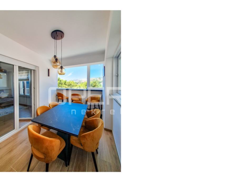 Na samo nekoliko koraka do kristalno čistog mora i šljunčane plaže skrivene u hladu borove šume, smješten je ovaj elegantno uređen stan u mirnom predjelu Rožac, Okrug Gornji.