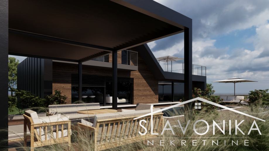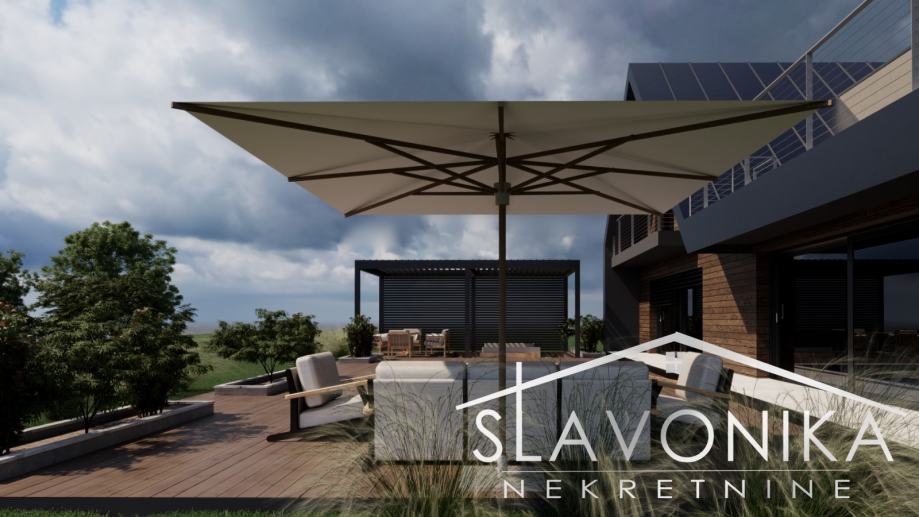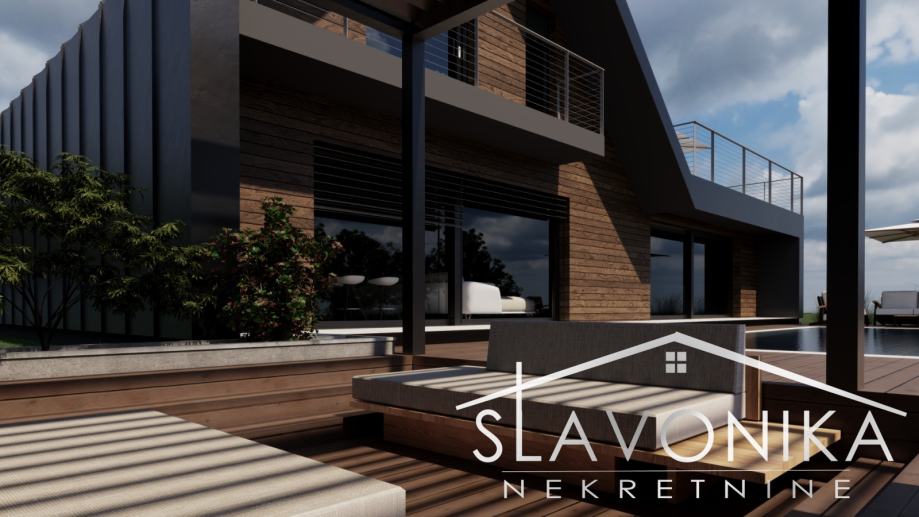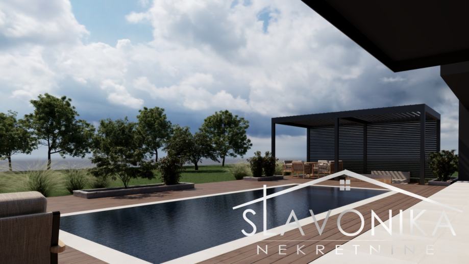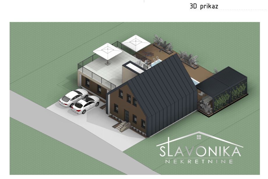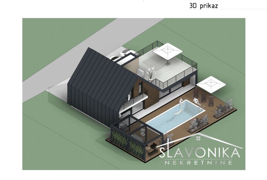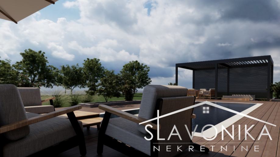 Projekat kuće, koja podrazumijeva katni oblik, ima i tri uređene terase: 17 m2, 64 m2 & 128 m2, sa izlazom na bazen i uređenim bazenskim okolišem, ali i strojarnicom za isti.