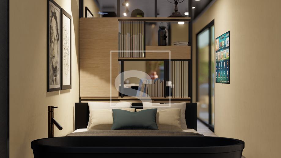 Kuća je ukupne neto stambene površine 27m2 te se sastoji od jedinstvene cjeline u vidu open space sistema. Ulaskom se ulazi u predsoblje/dnevni boravak koji nastavlja s kuhinjom u nizu te se na kraju nalazi kupaonica. S druge strane nalazimo spavaću sobu, odlično izmaknutu od dnevnog dijela visokim ormarima kao pregradu za odvajanje prostora te tako iskoristivši maksimalno svaki dio prostora. S obzirom na to da se radi o manjem objektu svaki pedalj prostora je iskorišten te se ukupni dojam prostora u stvarnosti dojma puno veći. Ispred same kuće nalazi se prostrana natkrivena terasa od ukupno 18m2 na kojoj se nalazi prostor za druženje s vanjskom ljetnom kuhinjom. U nastavku terase prelazimo na ne natkriveni dio terase koji je također popločen te tu počinje dio sunčališta i "plaže"bazena. Bazen je 12m2 površine te je i više nego dovoljan za osvježenje u toplim ljetnim mjesecima.