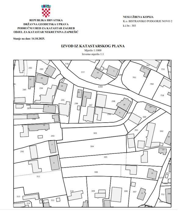 Na prodaju je atraktivno građevinsko zemljište katastarske oznake kč. br. 303, površine 1018, kat. općina 339563, BISTRANSKO PODGORJE NOVO 2.