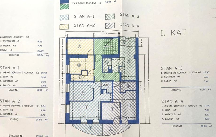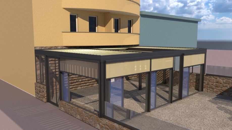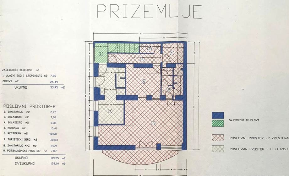 - Prizemlje: Restoran + Kuhinja + Turistički biro/recepcija + Sanitarni prostor za goste + Privatni sanitarni prostor (WC) + Skladište