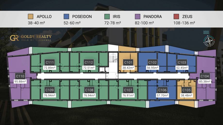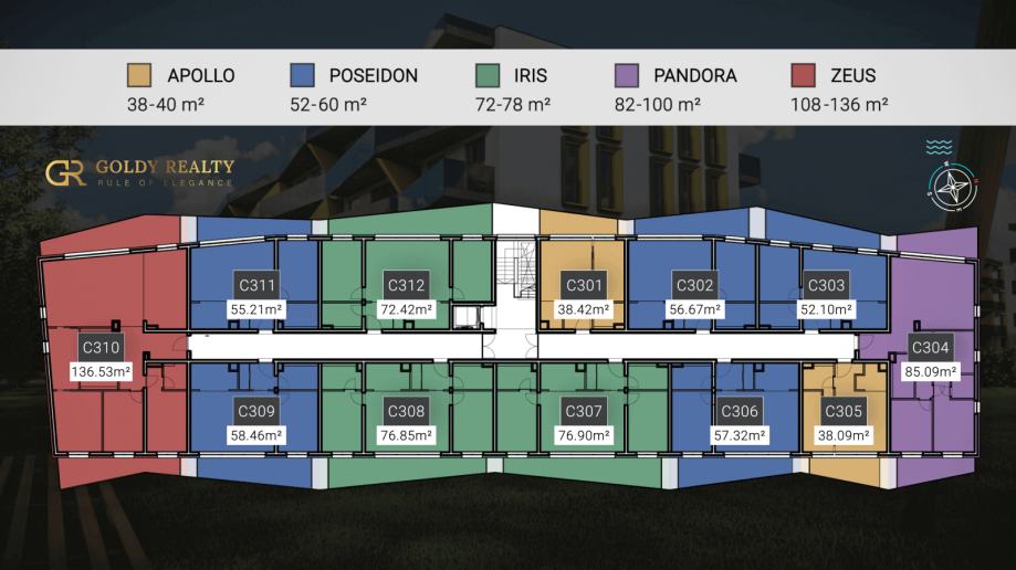 U prodaji je ukupno 88 stanova, od kojih su 5 tipskih stanova po kvadraturi (Zeus, Pandora, Iris, Poseidon i Apollo).