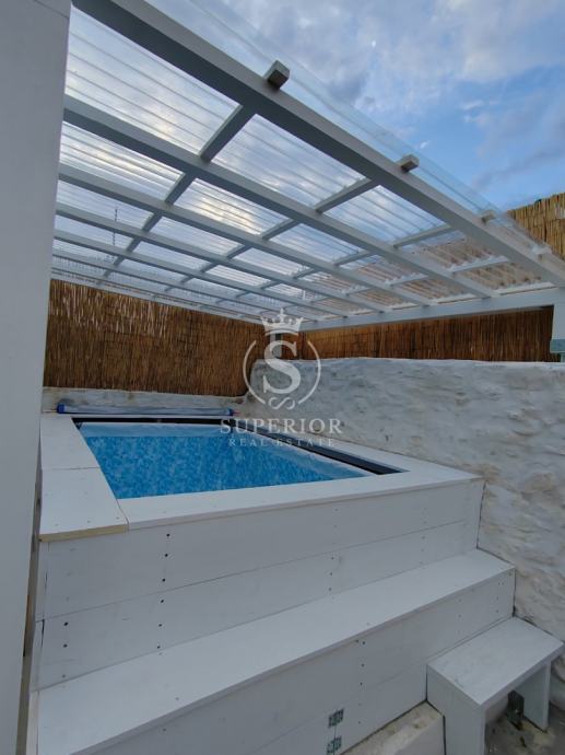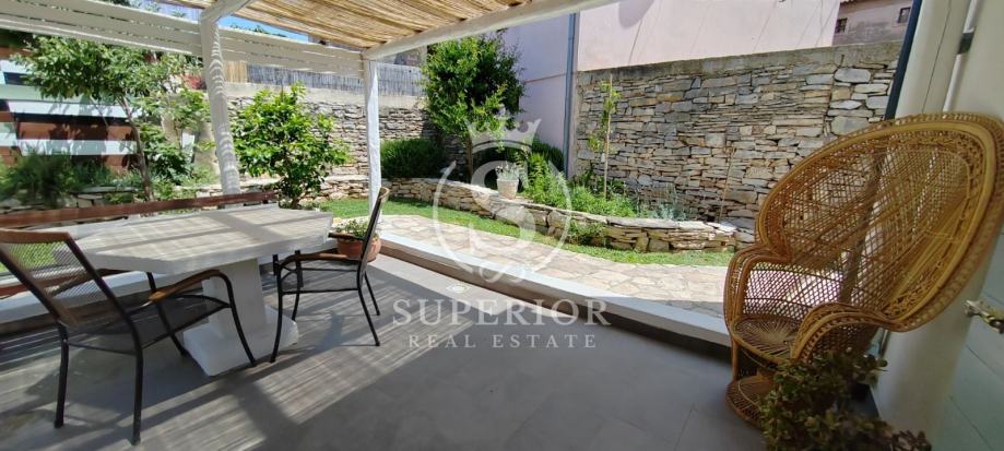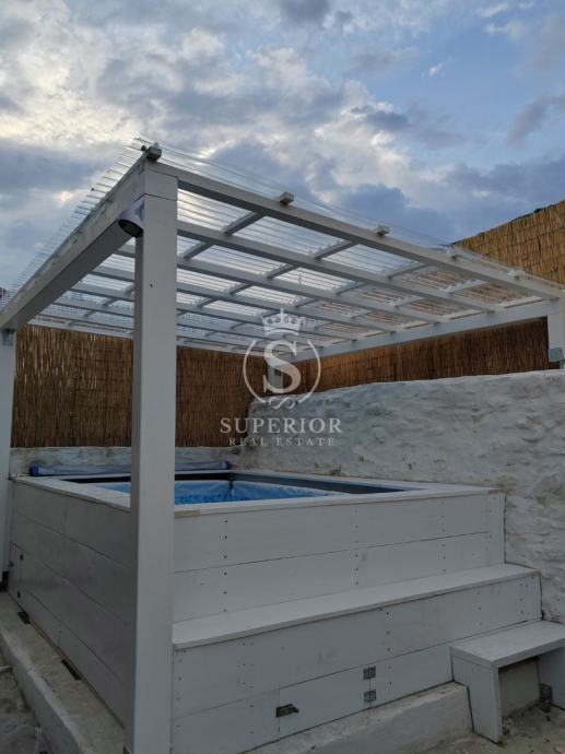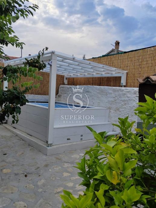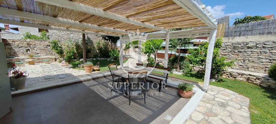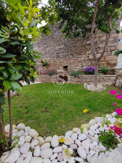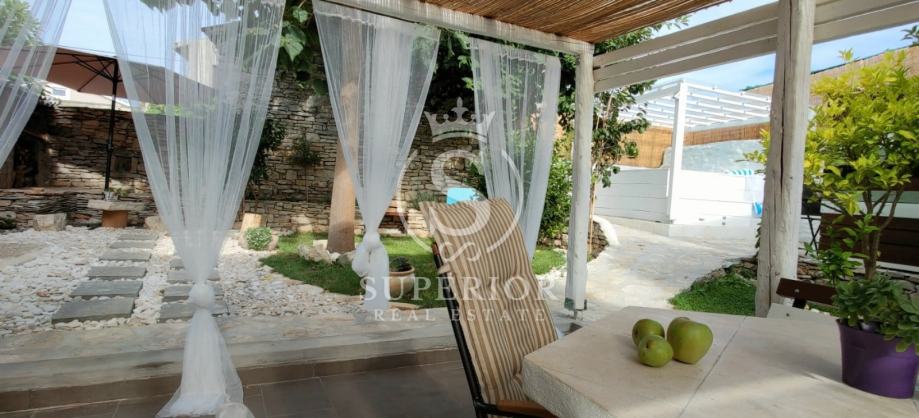 Dvorište, prepuno mediteranskog šarma, sadrži natkrivenu i popločenu terasu od 25 m² – savršenu za uživanje u obiteljskim obrocima ili druženjima pod zvijezdama. Travnjak, posađene voćke i začinsko bilje stvaraju prirodni vrtni raj, dok su roštilj, solarni tuš i jacuzzi tu da upotpune ljetnu idilu.