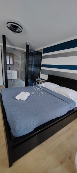 Na katu iste kvadrature nalazi se prostrana spavaća soba i moderno uređena kupaonica. Ova etaža pruža mir i intimnost, uz obilje dnevnog svjetla koje dodatno naglašava prirodne materijale i osjećaj topline. Svaki detalj pažljivo je usklađen, čineći prostor idealnim za odmor i svakodnevni život.