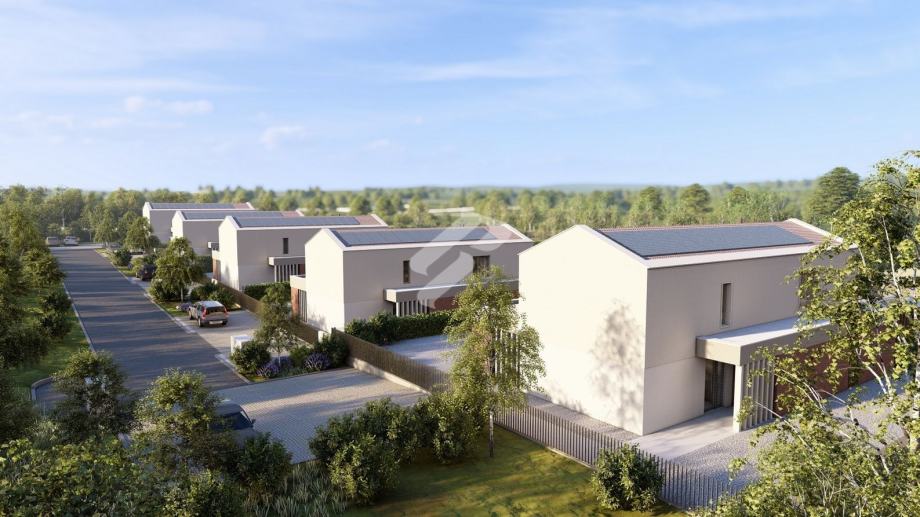 Predstavljamo ekskluzivan projekt pet samostojećih obiteljskih vila s bazenom , smještenih na mirnoj i zelenilom okruženoj lokaciji u Istri. Projekt je osmišljen s naglaskom na privatnost, udobnost i visoku kvalitetu života te predstavlja savršen spoj modernog arhitektonskog dizajna i autentičnog istarskog ambijenta. Neto stambena površina iznosi 283m2. Ukupna površina parcele iznosi 2.402 m², dok uređena okućnica obuhvaća 582 m², od toga 459 m² čine zelene površine, a 123 m² opločane vanjske terase. Površina parkirališta iznosi 81m². Kuća B pruža optimalan odnos između uređenih i zelenih površina, s naglaskom na prostranost, mir i sklad s prirodnim okruženjem. Vila se prostire na dvije etaže. U prizemlju se nalazi open space kuhinja, blagovaonica i dnevni boravak s izlazom na natkrivenu terasu i ljetnu kuhinju, grijani bazen s masažnim dijelom površine 48 m², unutarnje i vanjsko spremište te dodatna prostorija predviđena za saunu ili fitness. Na katu se nalaze četiri prostrane spavaće sobe, svaka s vlastitom kupaonicom i terasom.Sjeverni dio okućnice nudi veliku neizgrađenu površinu širine 24,7 metara i dužine oko 60 metara, idealnu za uređenje sportskih terena, dječjih igrališta ili privatnih vrtova, prema željama budućih vlasnika. Predviđena je ugradnja inverterskih klima uređaja, podnog grijanja na fan coil sistem te solarne elektrane, što osigurava visoku energetsku učinkovitost i ugodan boravak tijekom cijele godine.Na krovu kuće postavljeni su fotonapunski moduli ukupne snage 5,46kWp.U neposrednoj blizini nalaze se svi sadržaji potrebni za svakodnevni život — trgovine, škola, pošta, dom zdravlja, restorani i sportski objekti — što ovu lokaciju čini izvrsnim izborom kako za mirno obiteljsko stanovanje, tako i za turističko iznajmljivanje.Pet vila smješteno je na susjednim parcelama koje su međusobno povezane zajedničkim kolno-pješačkim prilazom s glavne prometnice na internu cestu. Vlasnik svake vile bit će suvlasnik s udjelom od 20% u internoj prometnici. Zahvaljujući konfiguraciji terena, kuće su pozicionirane na različitim visinama i međusobno odijeljene pojasom zelenila, čime se dodatno naglašava osjećaj privatnosti. Kolno-pješački prilaz i parkiralište nalaze se iznad razine prizemlja kuće te se objektu pristupa preko nekoliko stepenica, što vilama pruža dodatnu intimnost i skriva ih od pogleda s glavne ceste.