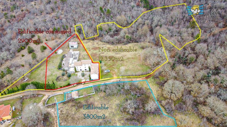 Nekretnina je smještena na prostranoj parceli od 19.000 m2, od kojih je 6.700m2 građevinskog terena gdje se, ovisno o željama budućeg kupca, mogu izgraditi i dodatni objekti.