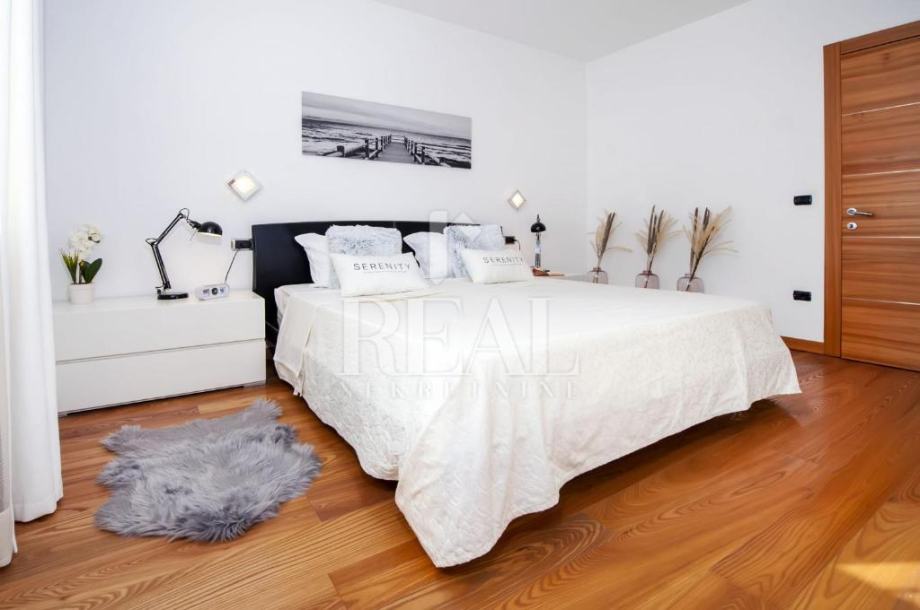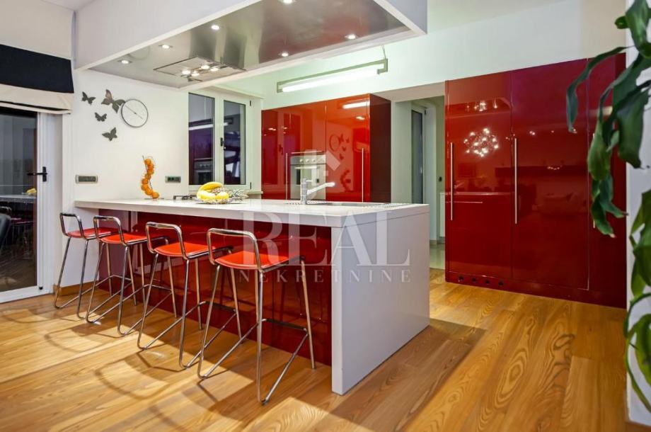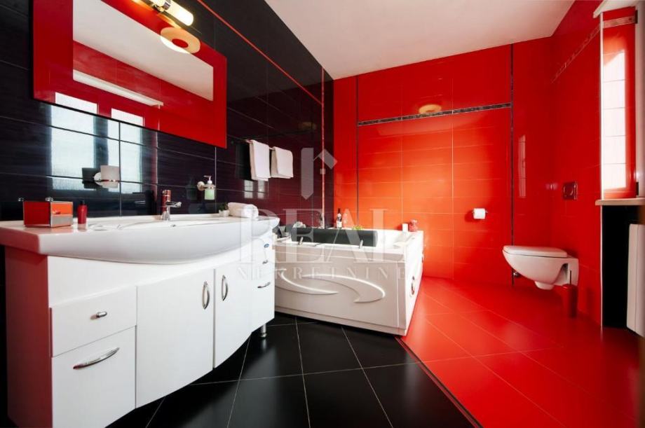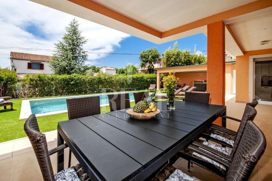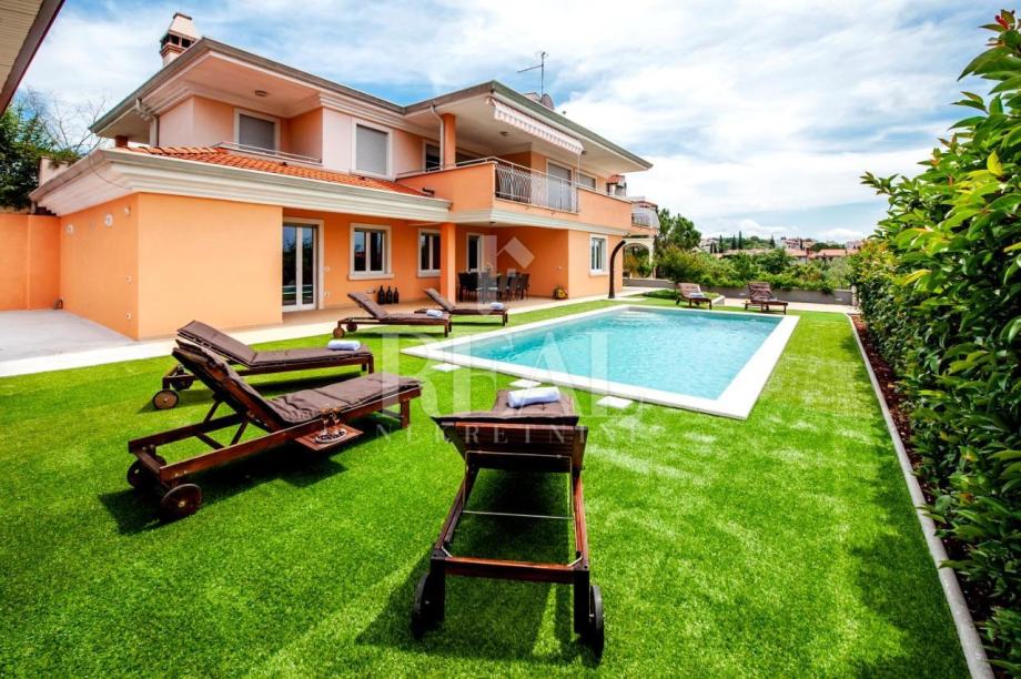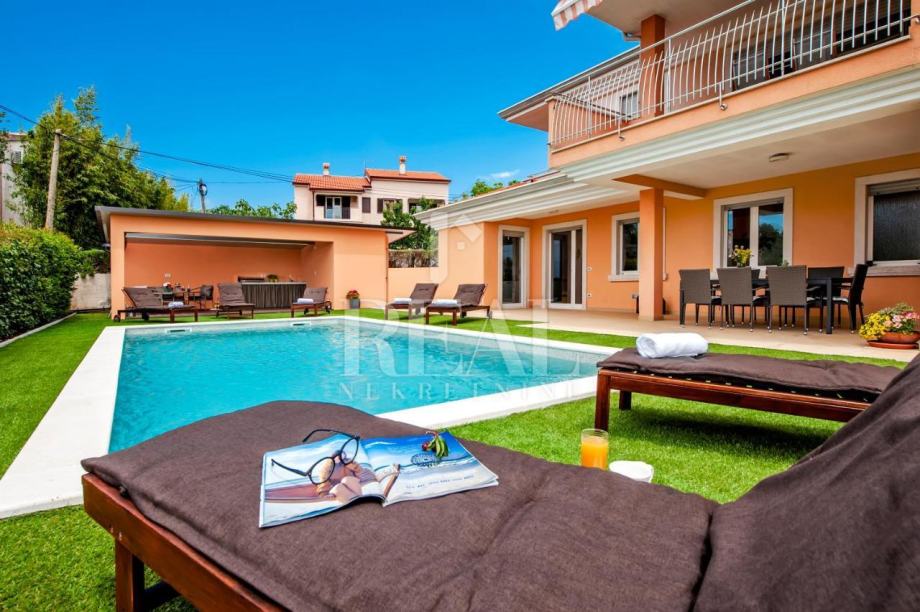 Nedaleko od prekrasnog Rovinja smjestila se ova moderna villa od 550m2 stambene površine. Nalazi se u obiteljskom susjedstvu udaljena svega 5 km od rovinjskih plaža, restorana i trgovina. Prostire se na dvije etaže, u prizemlju je smješten apartman sa jednom spavaćom sobom, kuhinjom i dnevnim dijelom te spavaćom sobom i kupaonicom. Uz apartman je i veća konoba sa kaminom i direktnim izlazom na bazen te uređenu okućnicu. Na prvom katu su kuhinja sa dnevnim dijelom i blagavaonicom, tri spavaće sobe, dvije kupaonice te velika natkrivena terasa. Grijanje je na klima uređaj i plinsko etažno .Kompletno je opremljena te u funkciji ljetnog najma. Prednost objekta je i velika okućnica od 1970m2 na kojoj je smješten grijani bazen i koja pruža potpunu privatnost i mir.