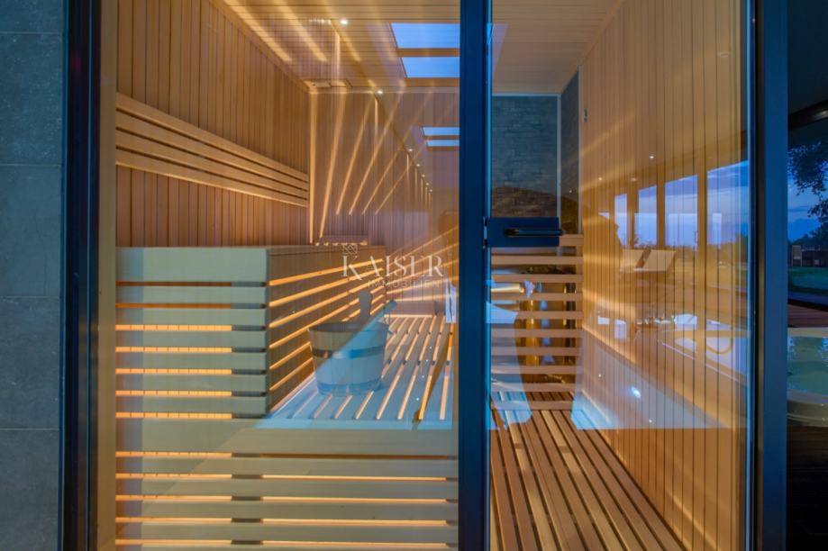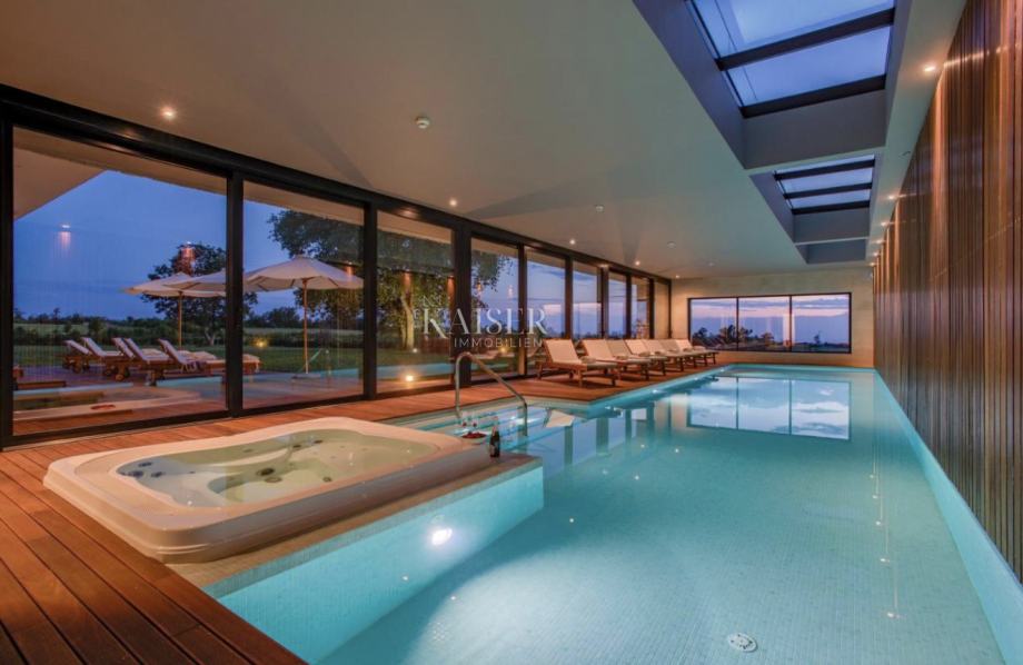 Vila ima impresivan zatvoreni bazen od 70 m2 (duljine 18 m), čije staklene stijene ljeti možete otvoriti kako biste doživjeli potpuni spoj unutarnjeg i vanjskog prostora, dok zimi pruža topli, ugodan ambijent za opuštanje.
