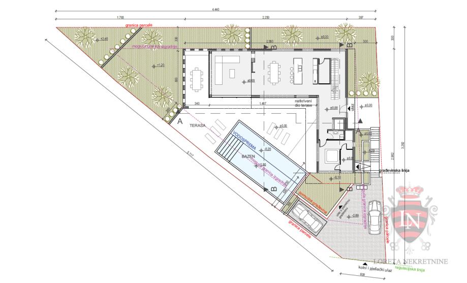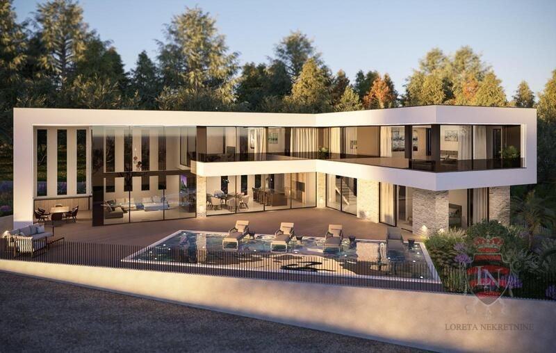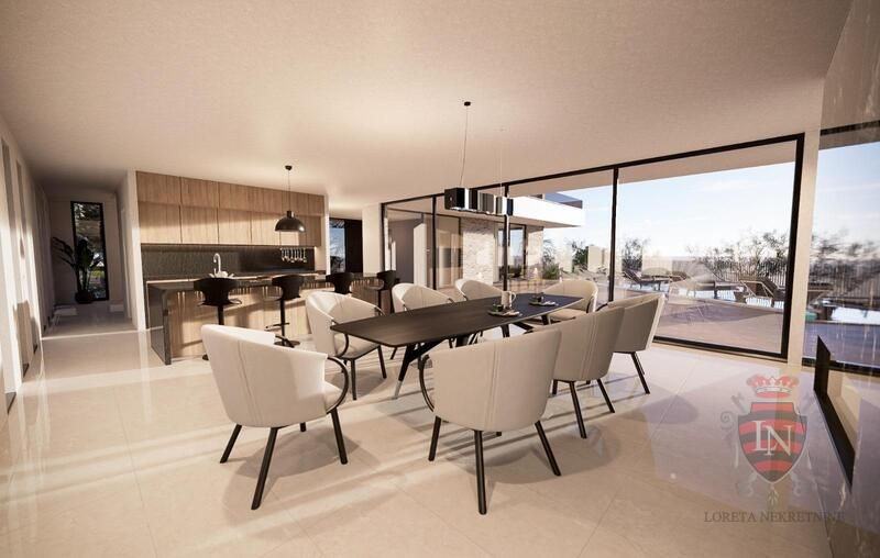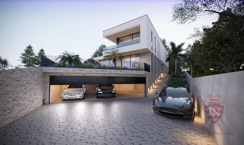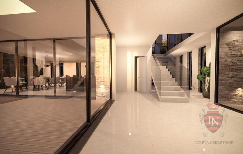 Stambena građevina smještena je u gradivom dijelu građevne čestice bliže njezinoj istočnoj strani. Ulaz u građevinu osiguran je s istočne strane. Sama građevina organizirana je na način da je ulaz smješten na prizemlju, a blago kosi teren riješen je kaskadno. Osim ulaznog prostora sa stubištem koje vodi u etažu kata, u prizemlju nalaze se i dnevni boravak, kuhinja s blagovanjem, izba, hodnik, lift, wc, te jacuzzi sa saunom. Na etaži kata nalaze se hodnik, lift, te četiri spavaće sobe sa vlastitim kupaonicama. U sklopu jedne sobe je 'walk in' ormar. Etaža 1.kata ima i natkrivenu terasu te pogled na dnevni boravak u prizemlju kuće. Iz prizemlja se izlazi na terasu s bazenom s jugoistočne strane. Okolnom kultiviranom parteru ozelenjenom autohtonim biljem pristupa se izravno s etaže prizemlja. U podrumu se nalaze wc, fitness i strojarnica, a pristup je liftom, unutarnjim stepenicama, ili rampom s vanjskih stepenica.