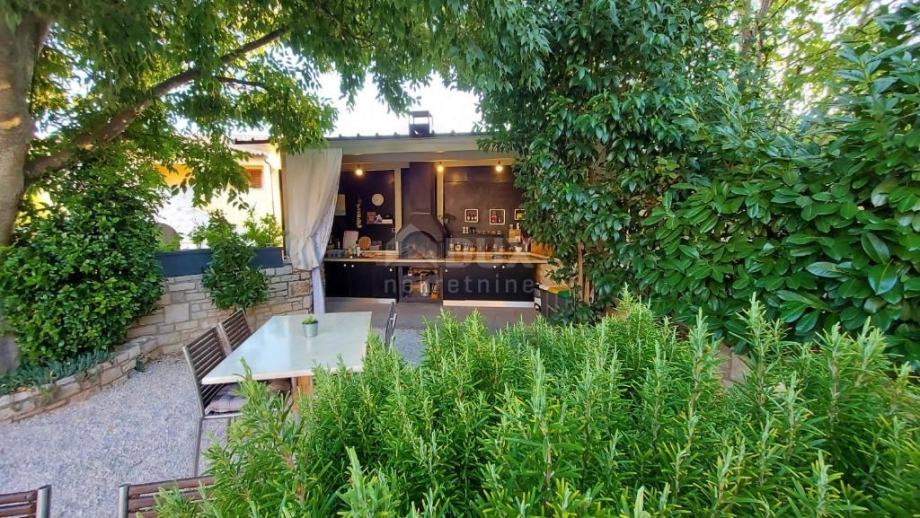 Okućnica vile od 624m2 u potpunosti je ograđena i skrivena od pogleda. Okućnica je održavana i uređena brojnim mediteranskim biljem, te prostranom zelenom površinom o kojima brine sustav automatskog navodnjavanja. U privatnome dijelu okućnice koji se nalazi sa stražnje strane vile ,smjestio se bazen sa sunčalištem, kao i prostrana natkrivena ljetna kuhinja s roštiljem, idealna za zabavu i odmor s prijateljima i obitelji. Na okućnici se nalazi dovoljno parking mjesta za 4 automobila, dok postoji mogućnost parkinga i izvan okućnice.