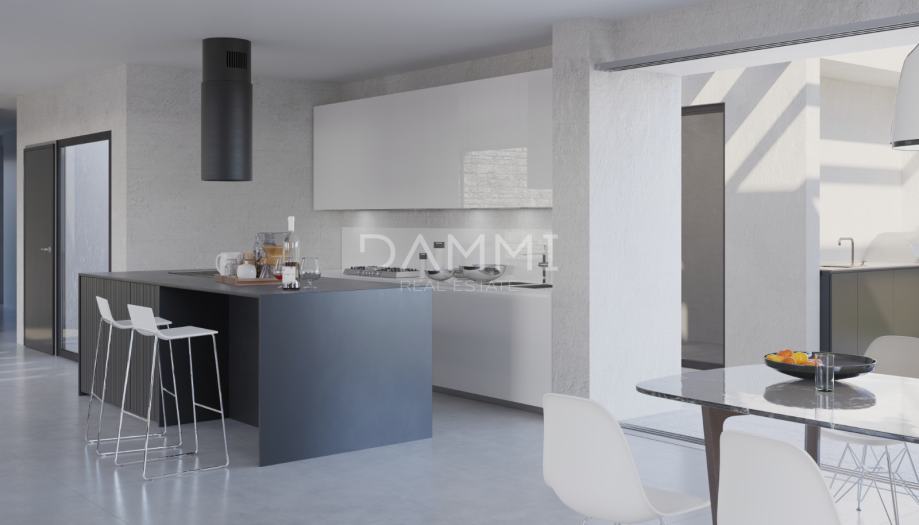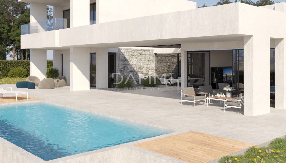 Prodaje se moderna vila u izgradnji koja se smjestila na specifičnoj lokaciji, površine 1260 m2, okružena maslinicima sa koje se pruža panoramski pogled na more, grad Rovinj te Brijunsko otočje.